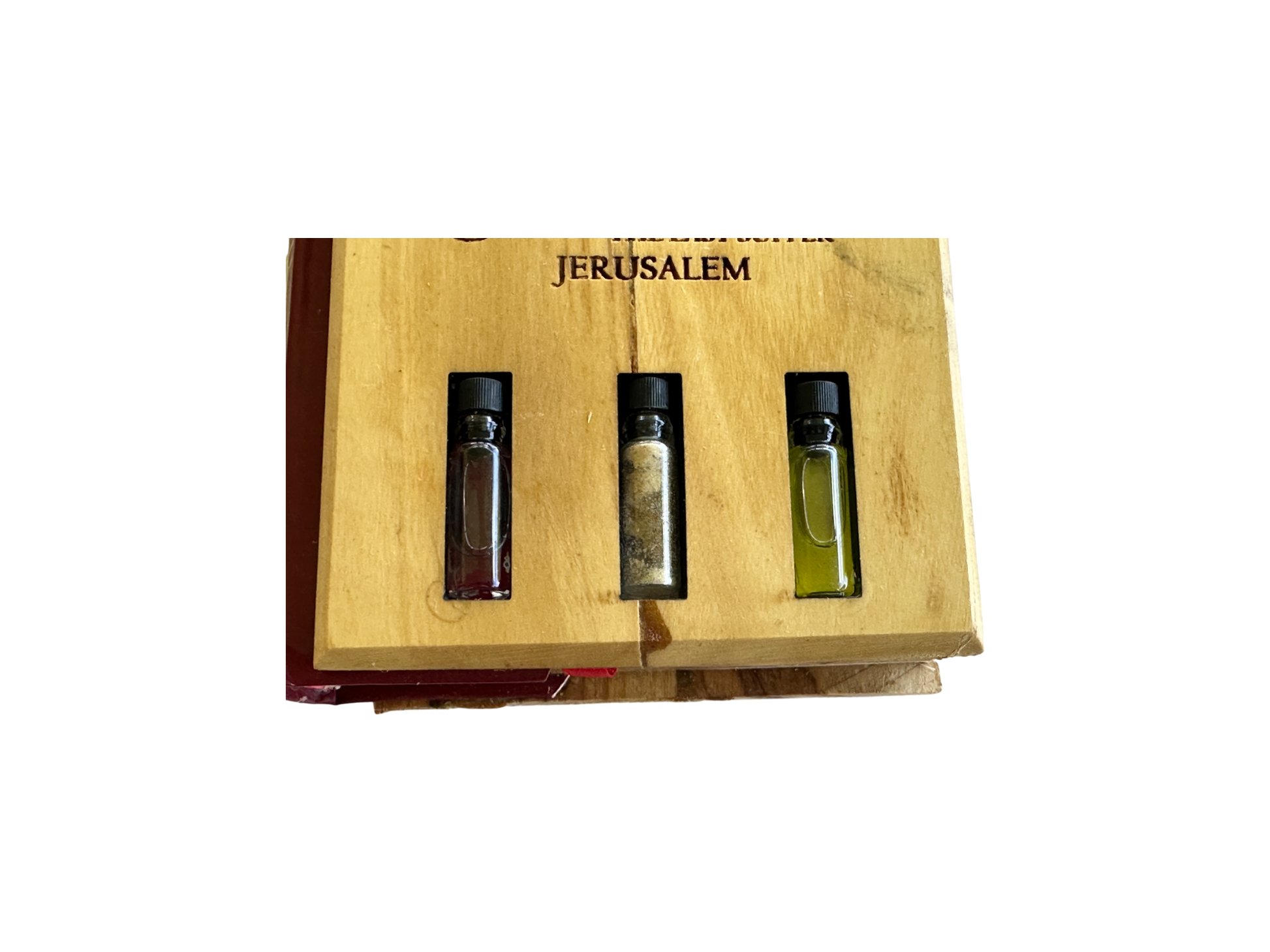 Inside, you’ll find a collection of sacred items—incense, holy water, holy oil, and frankincense—each sourced directly from Jerusalem. These elements enrich your devotional experience and offer a tangible connection to the land of Christ’s life and ministry.