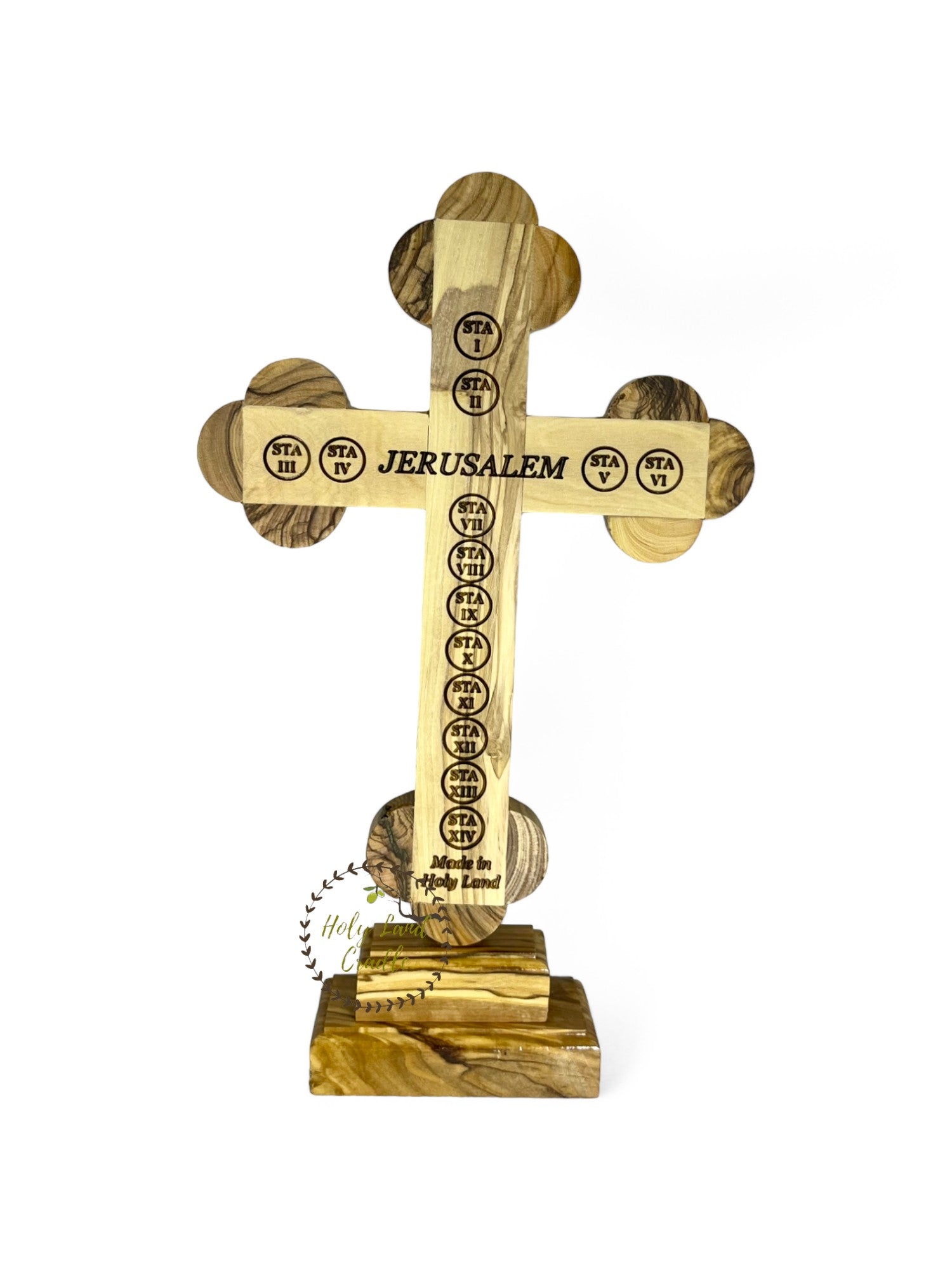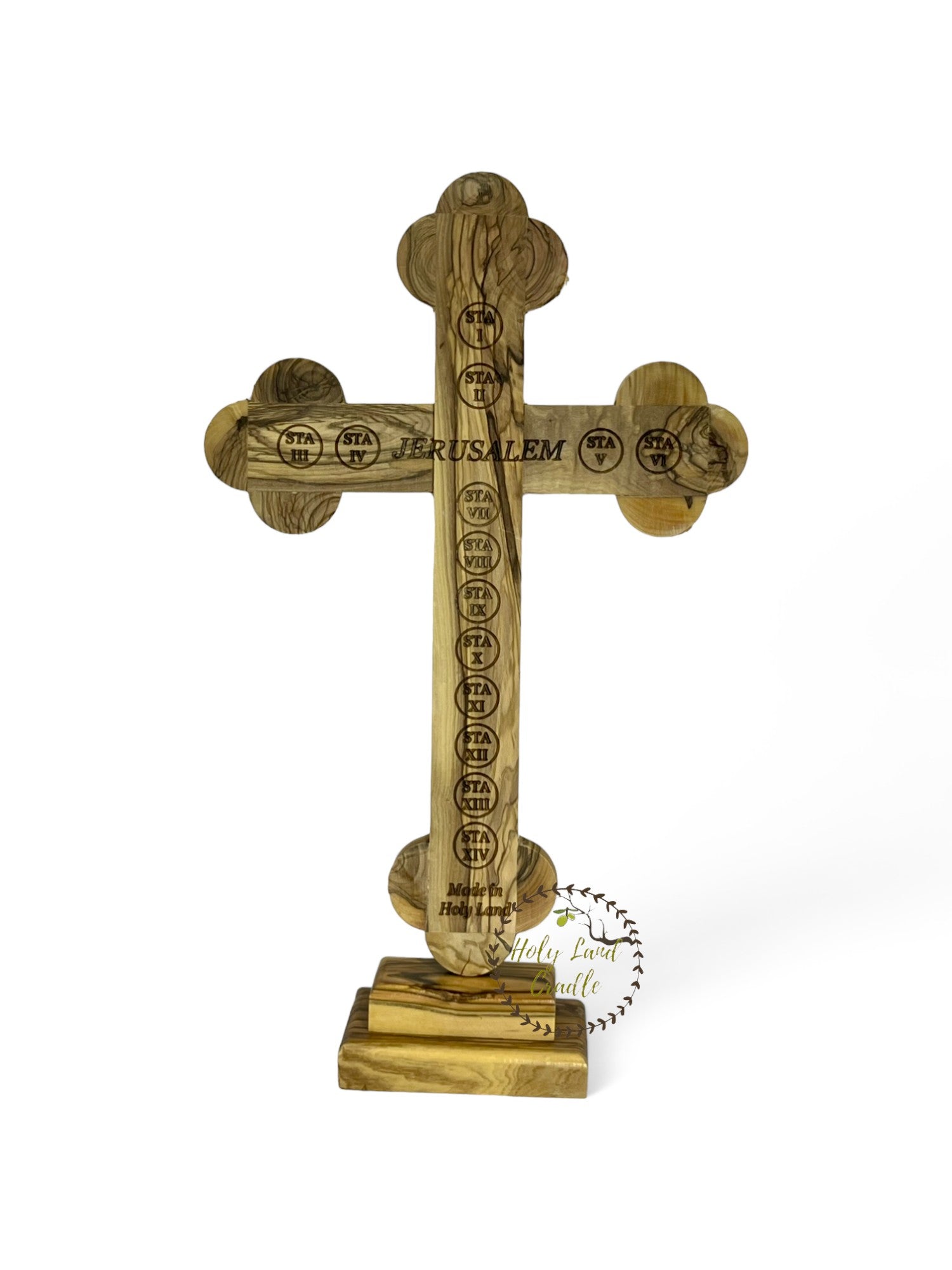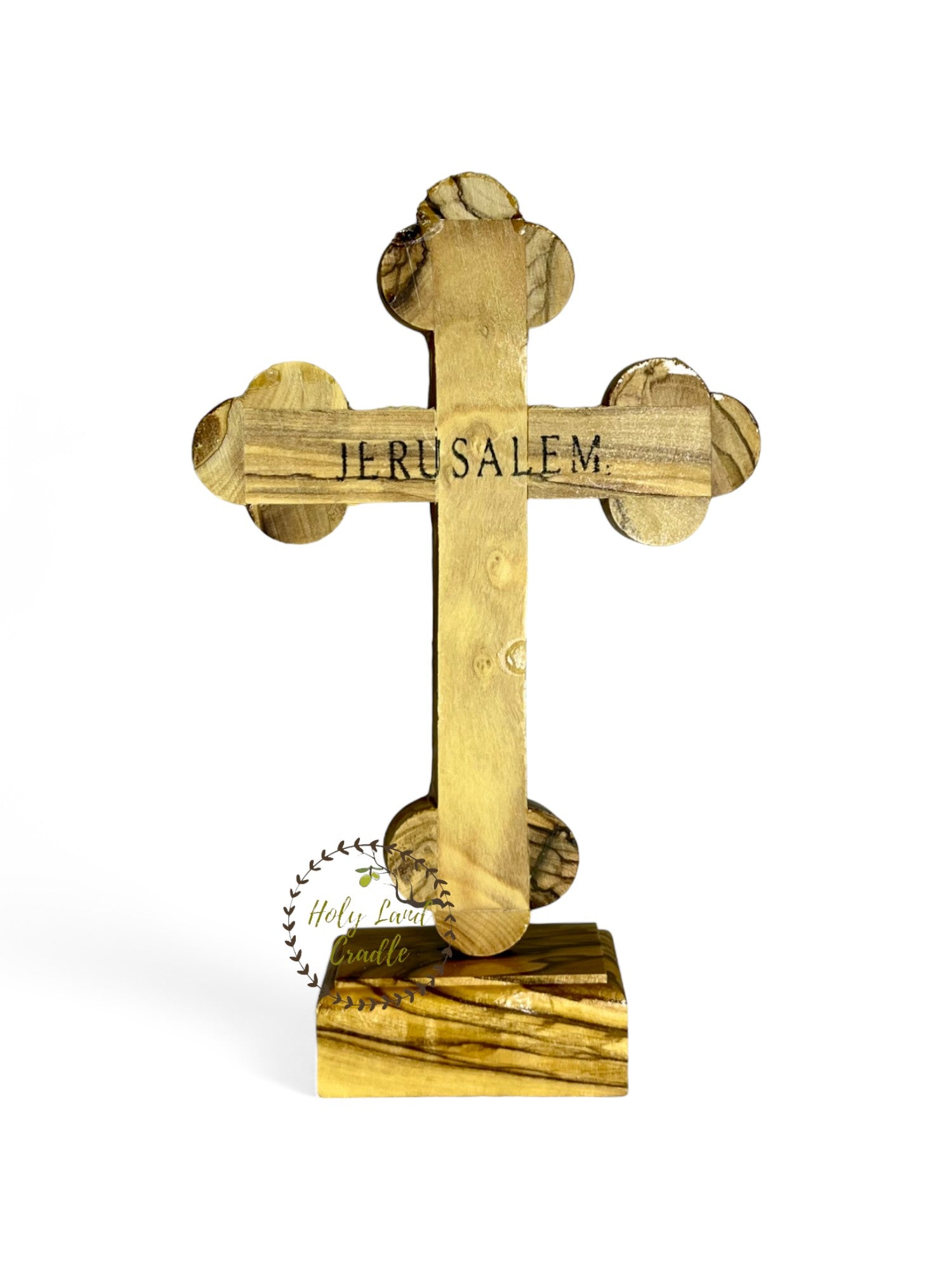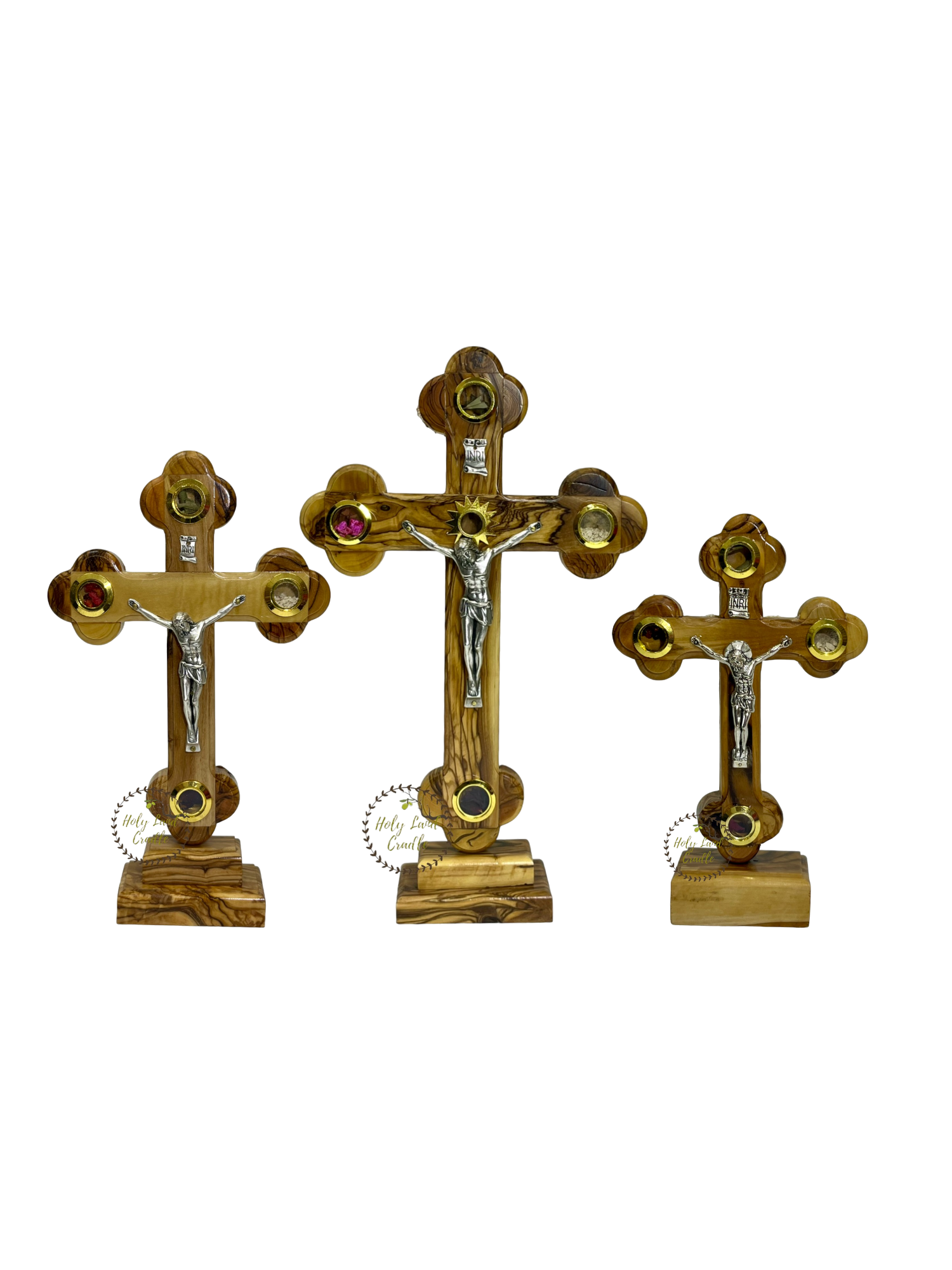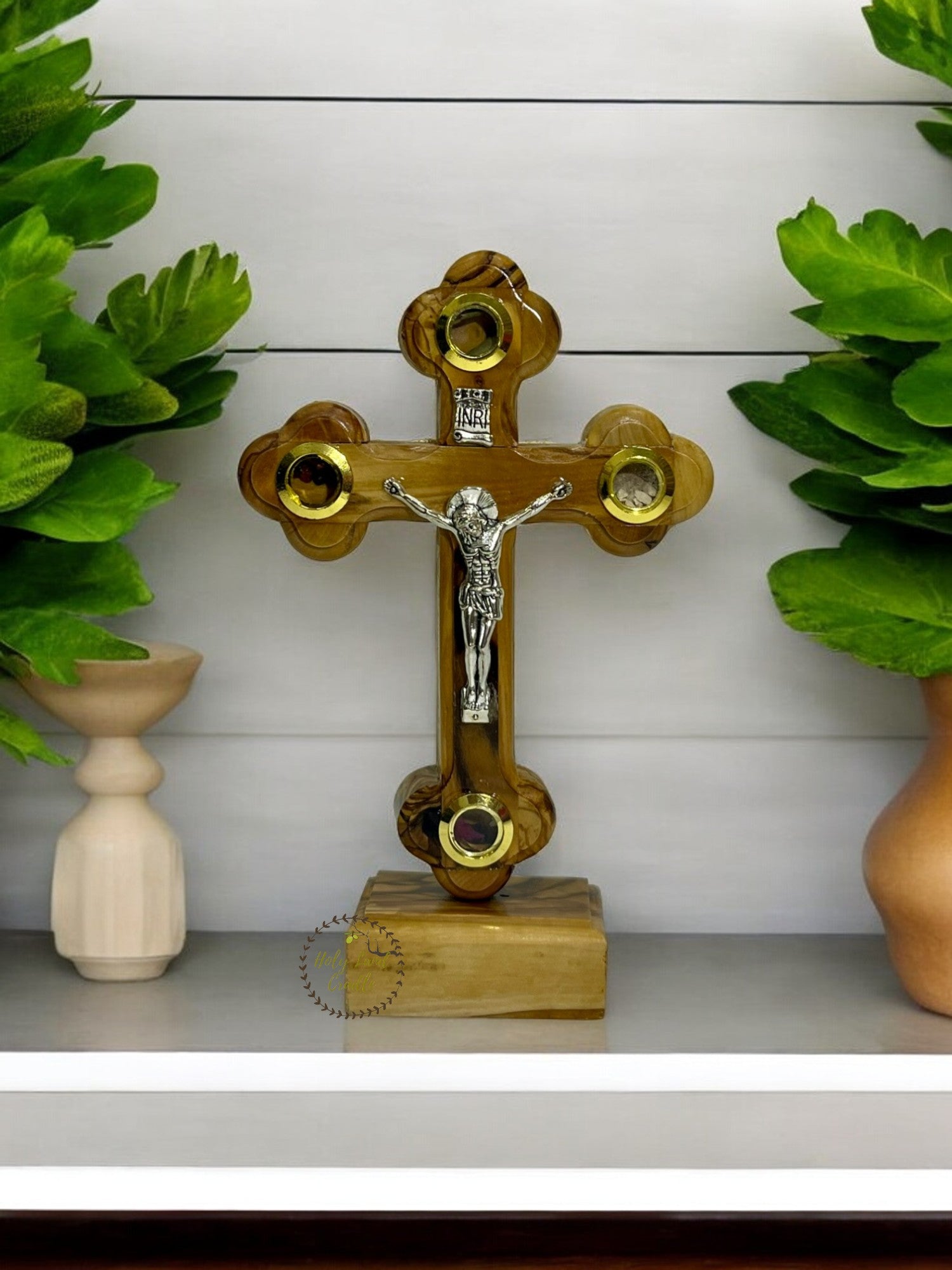 Mounted on a sturdy base, the cross features a silver-plated Crucifix and four glass capsules filled with incense, leaves, and soil from the Holy Land. These elements offer a tangible connection to the sacred places of Christ’s life, death, and resurrection.
