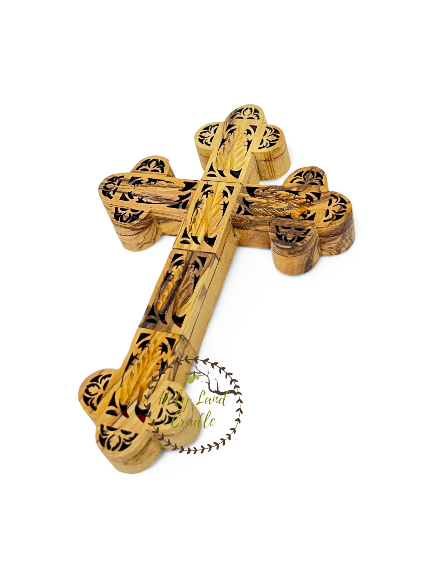 Bring a sacred touch to your home with this handcrafted Olive Wood Double Cross, made in Bethlehem—the birthplace of Jesus. This unique wall hanging features a dynamic double cross design, with vibrant red paper at its heart symbolizing divine love and sacrifice.