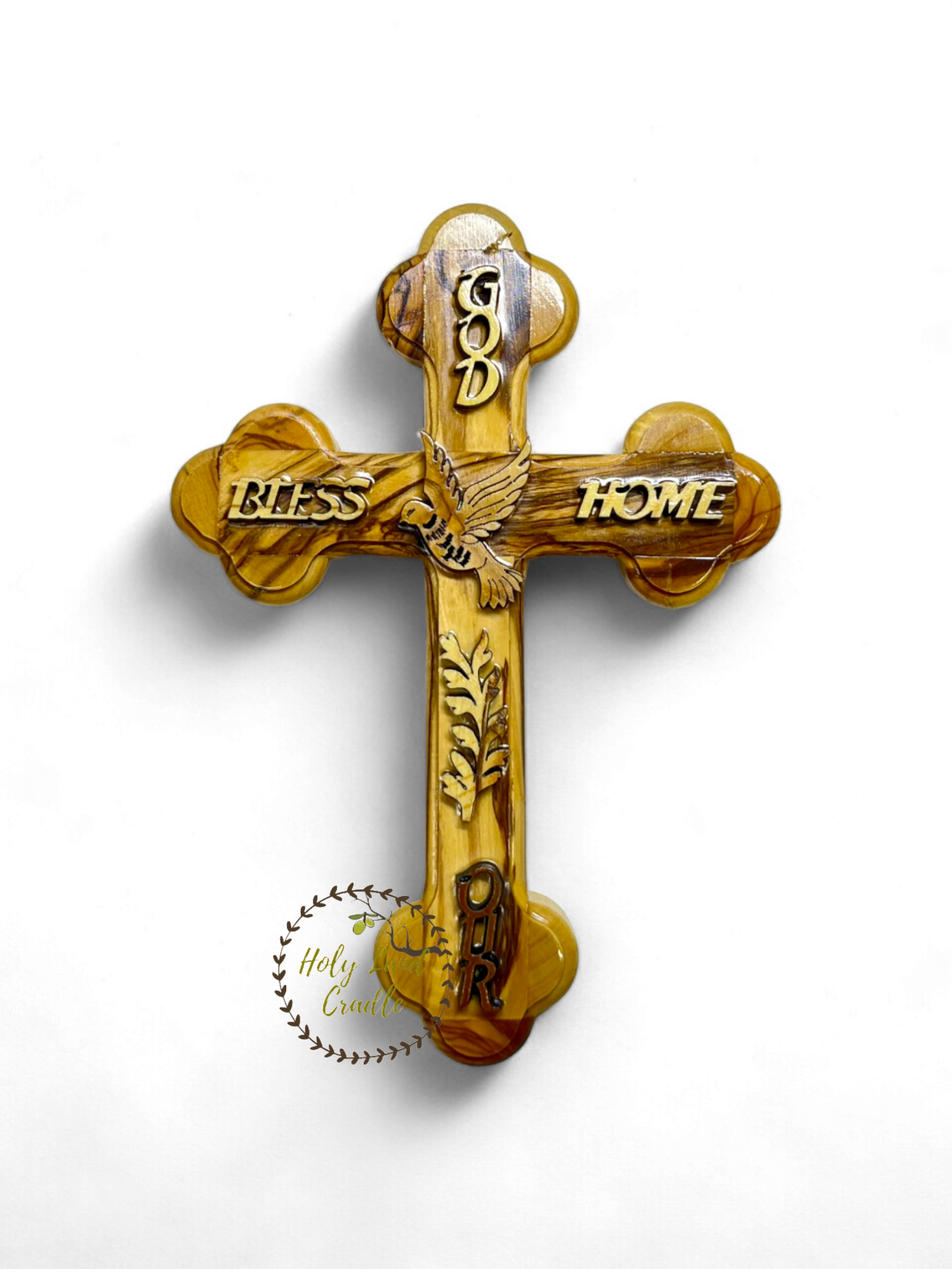Handmade with love in Bethlehemāthe Holy Landāthis beautifully carved olive wood cross is a heartfelt blessing for any home. Featuring the words āGOD BLESS OUR HOMEā and a delicately engraved peace dove carrying an olive branch, this piece radiates warmth, serenity, and divine protection.