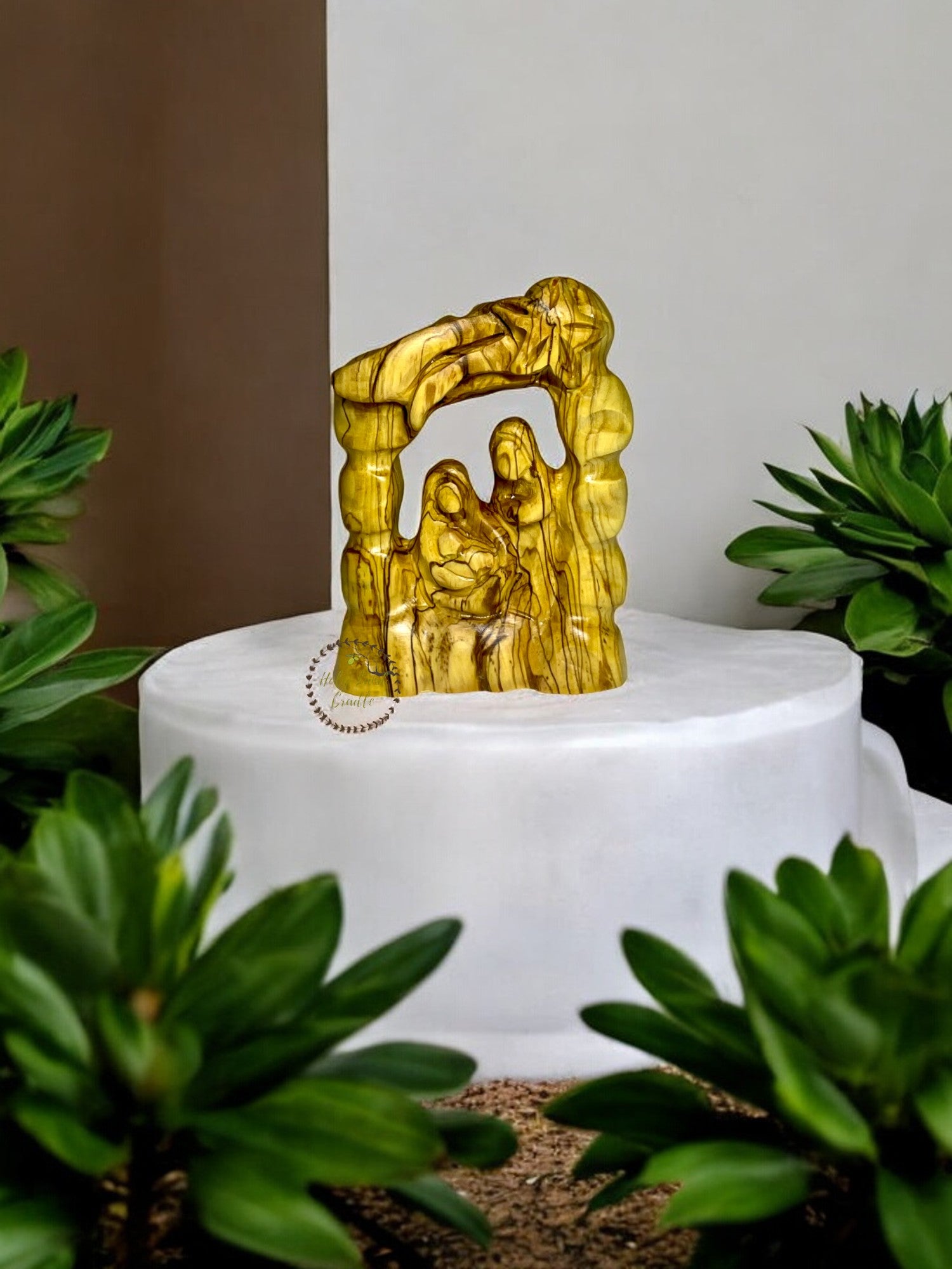 The Olive Wood Holy Family in Door Blocks Shape is an exquisite decorative piece that embodies the spirit of the Nativity. Handcrafted with care and devotion, this piece features the Holy Family—Mary, Joseph, and Baby Jesus—within a door-shaped frame, enhanced by the symbolic Star of Bethlehem.