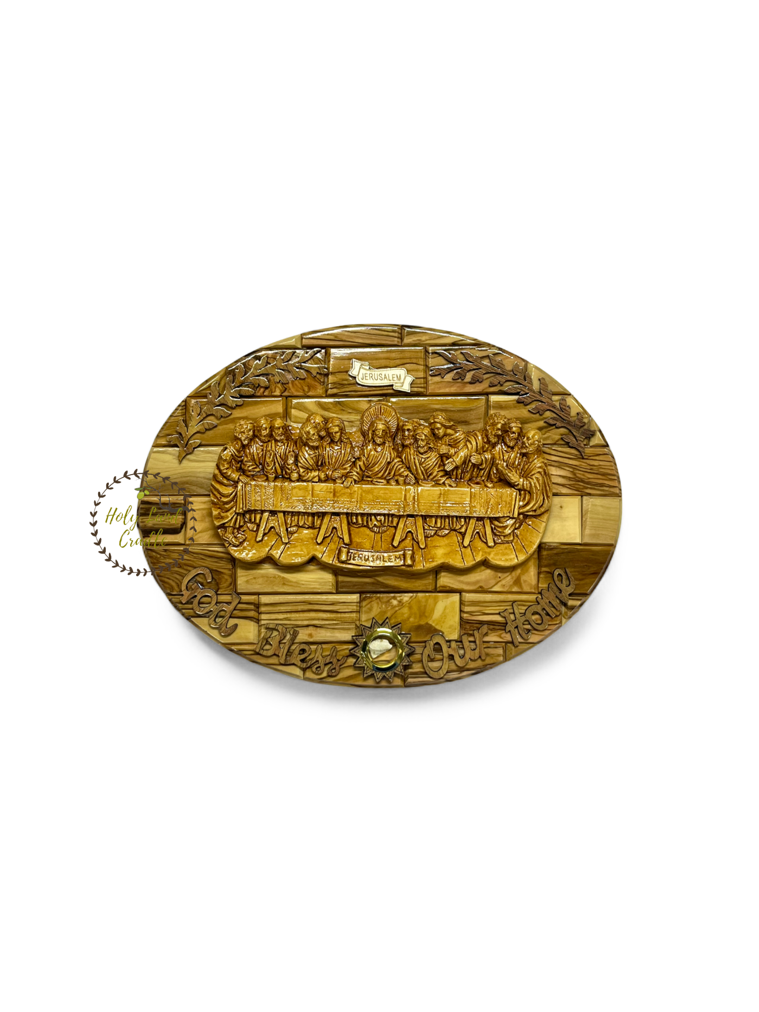This beautifully crafted olive wood plaque features a detailed representation of the Last Supper, a pivotal moment in Christian history. Handcrafted from genuine olive wood sourced from the Holy Land, this piece captures the depth and significance of the event, where Jesus shared His final meal with His disciples.