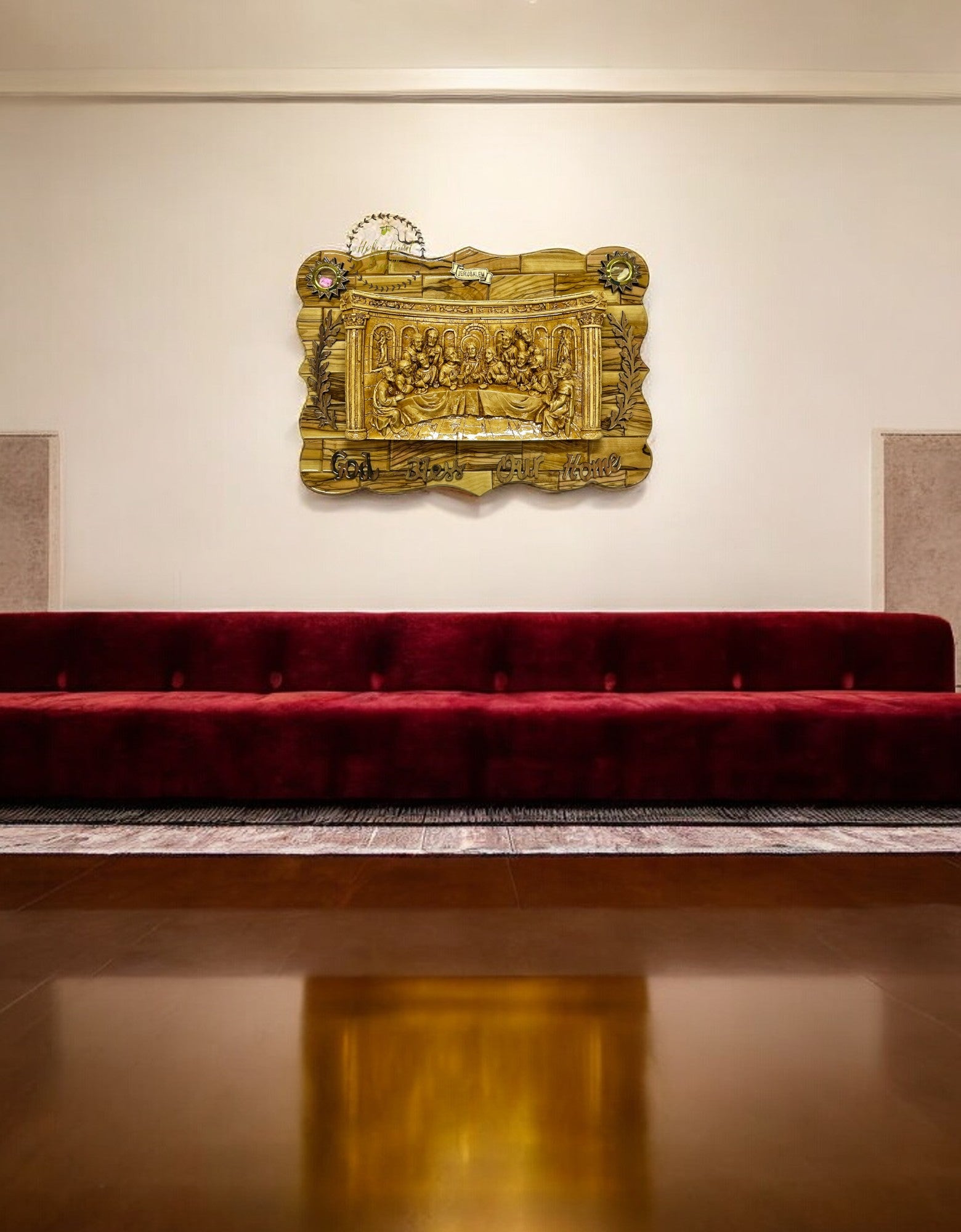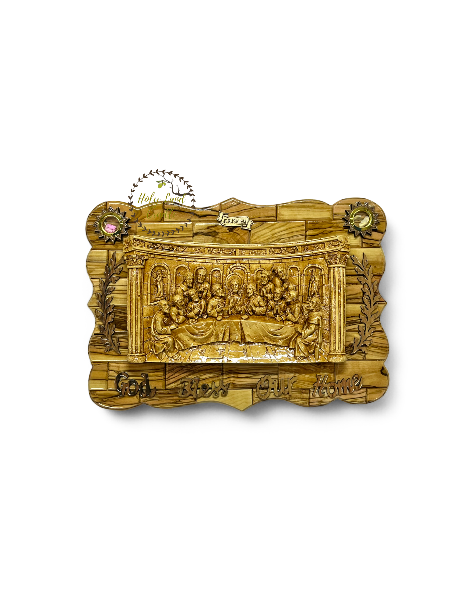 The Last Supper scene is intricately carved, capturing the solemnity and reverence of Jesus' final meal with His disciples. The natural beauty of the olive wood, with its unique grain and rich tones, enhances the artistic detail, making each plaque a one-of-a-kind treasure.
