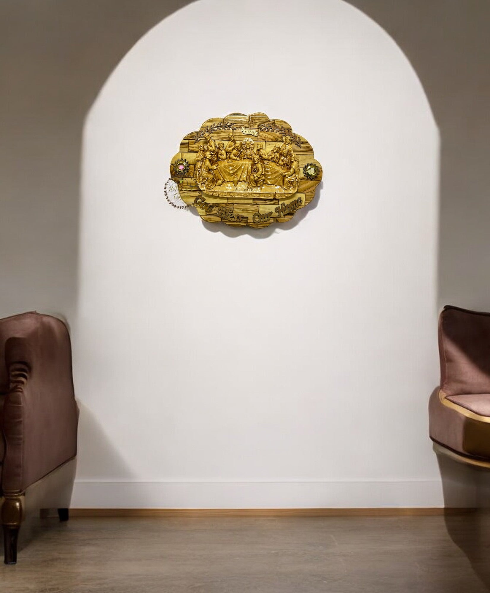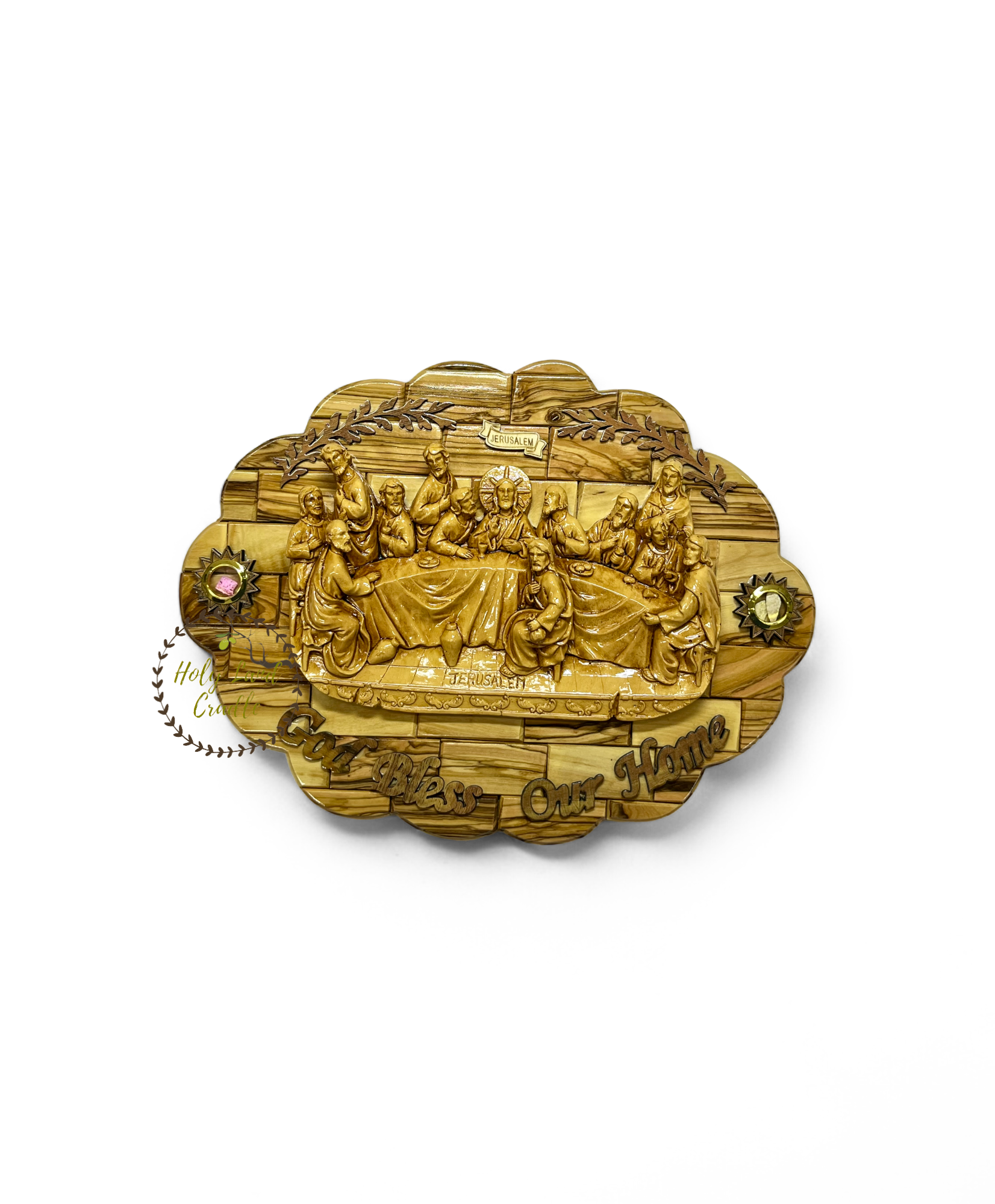 The Last Supper scene is intricately carved, capturing the solemnity and reverence of Jesus' final meal with His disciples. The natural beauty of the olive wood, with its unique grain and rich tones, enhances the artistic detail, making each plaque a one-of-a-kind treasure.