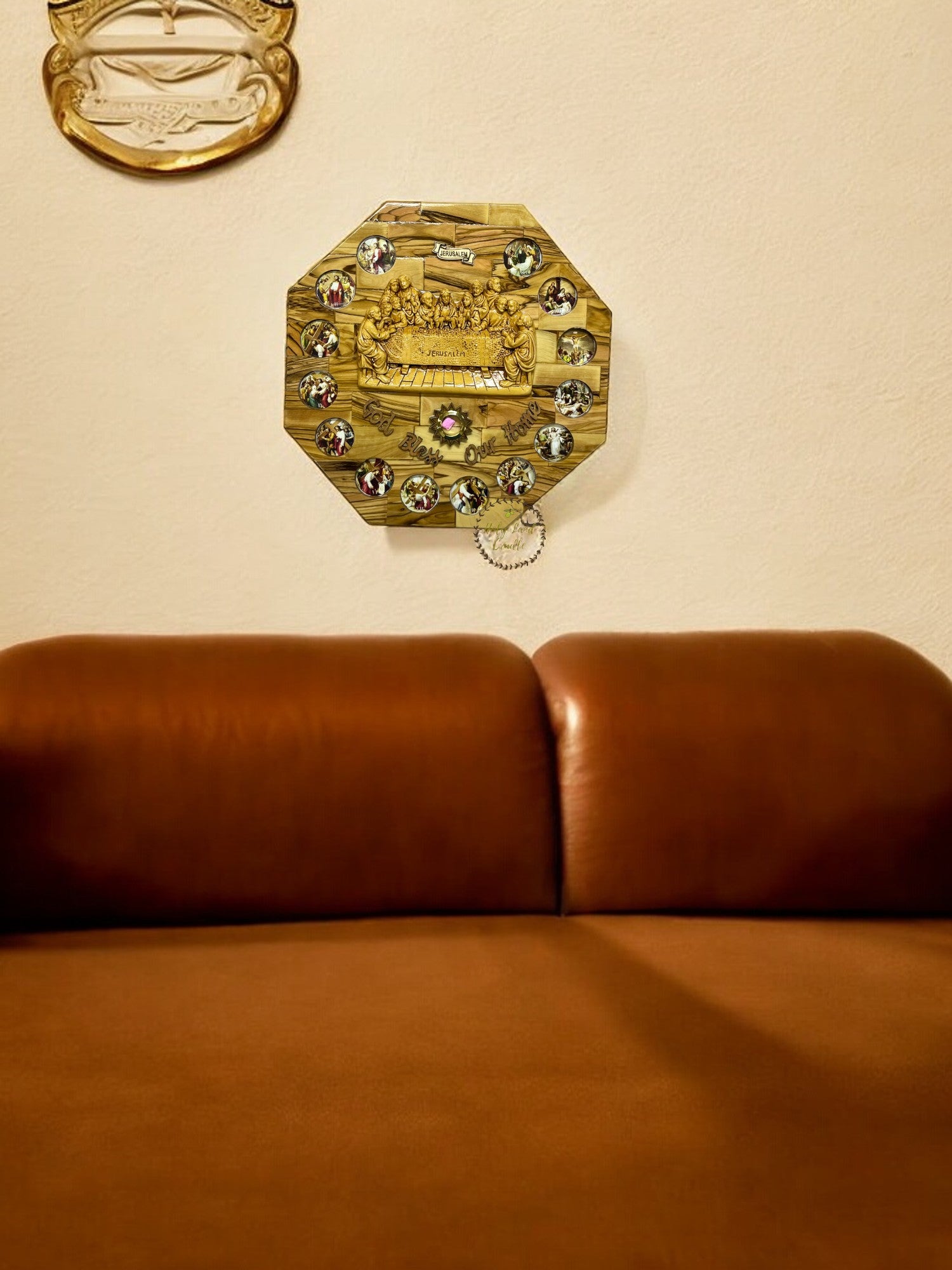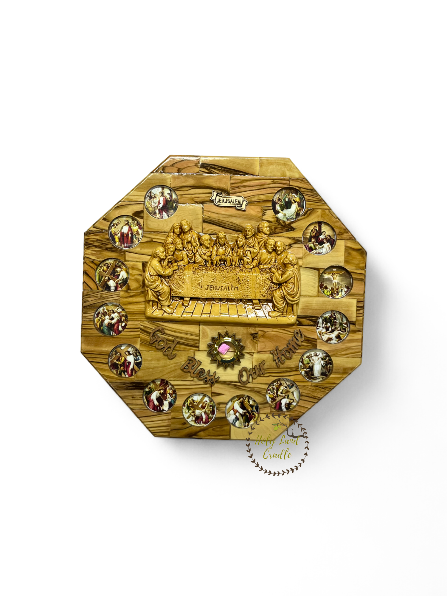 This exquisite olive wood plaque features a detailed depiction of the Last Supper, offering a rustic and authentic touch. Handcrafted from genuine olive wood sourced from the Holy Land, this plaque also includes the 14 Stations of the Cross, making it a powerful symbol of faith and devotion.
