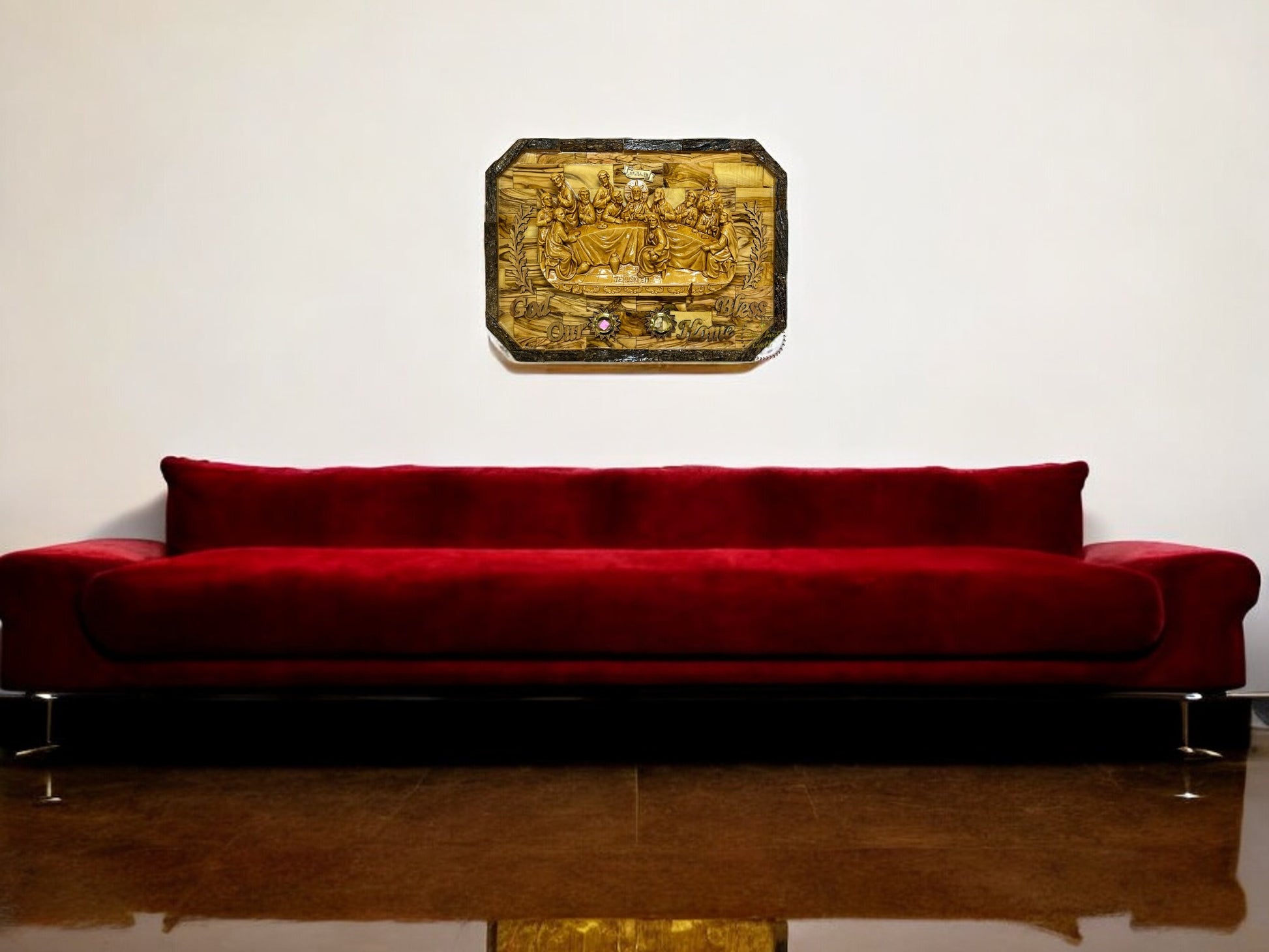 This unique olive wood plaque presents a beautiful depiction of the Last Supper, enhanced by the natural bark of the olive tree, giving it a rustic and authentic feel. Handcrafted from genuine olive wood sourced from the Holy Land, this plaque captures the sacredness of Jesus' final meal with His disciples, making it a meaningful addition to any religious space.
