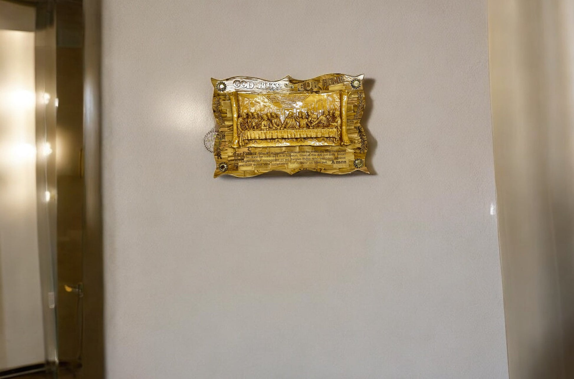 This beautifully crafted olive wood plaque features a detailed depiction of the Last Supper, combined with the profound words of the Our Father prayer engraved beneath it. Handcrafted from authentic olive wood sourced from the Holy Land, this plaque is not only a visual masterpiece but also a deeply spiritual piece that enhances any sacred space.
