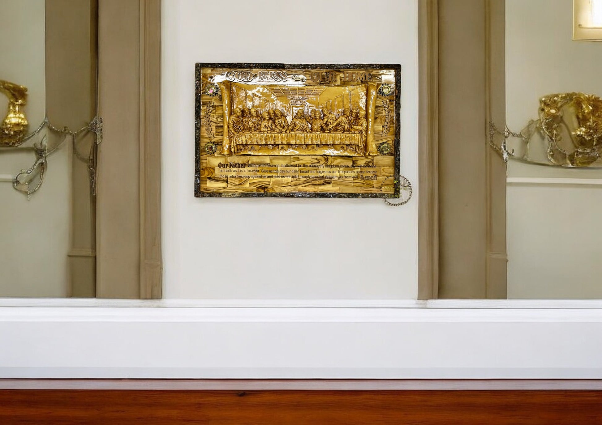 This beautifully crafted olive wood plaque features a detailed depiction of the Last Supper, combined with the profound words of the Our Father prayer engraved beneath it. Handcrafted from authentic olive wood sourced from the Holy Land, this plaque is not only a visual masterpiece but also a deeply spiritual piece that enhances any sacred space.