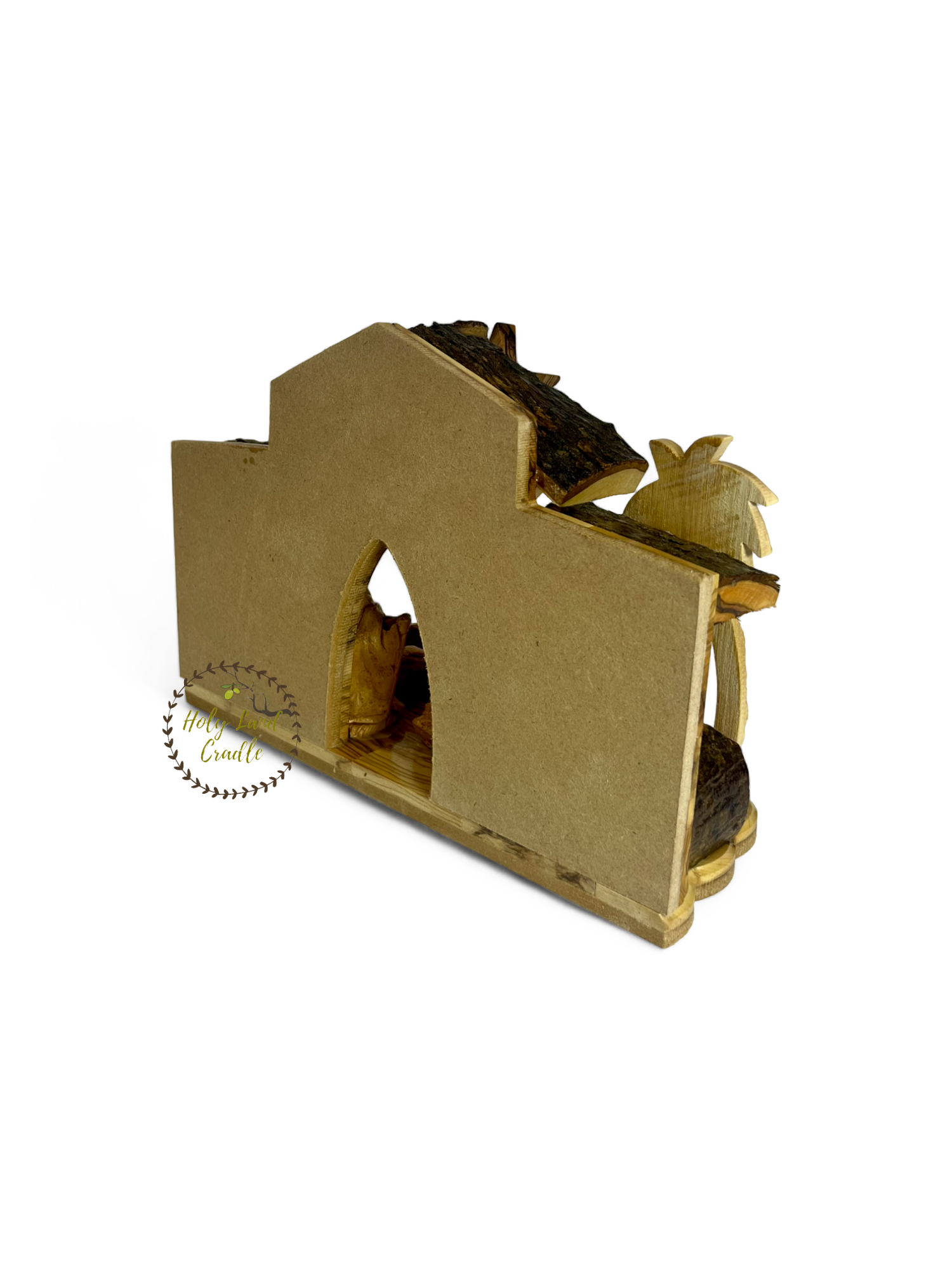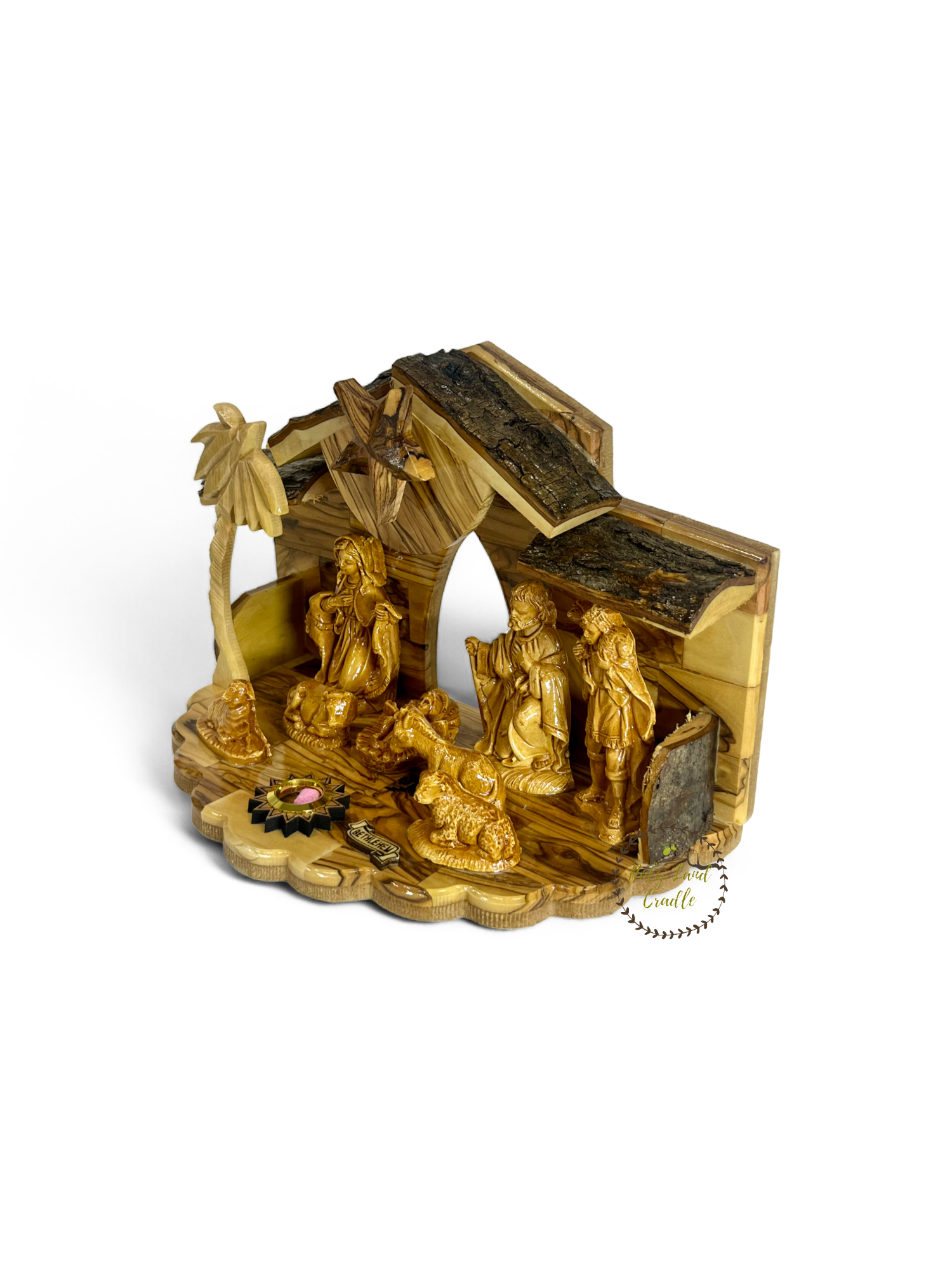 This exquisite nativity set is handcrafted from genuine olive wood, featuring a rustic bark finish and a unique three-roof design. The scene includes finely detailed ceramic figures, each hand-painted to capture the essence of the Nativity story. Made by skilled artisans in Bethlehem, this set is a perfect blend of tradition and artistry, ideal for adding a touch of the Holy Land to your holiday decor.