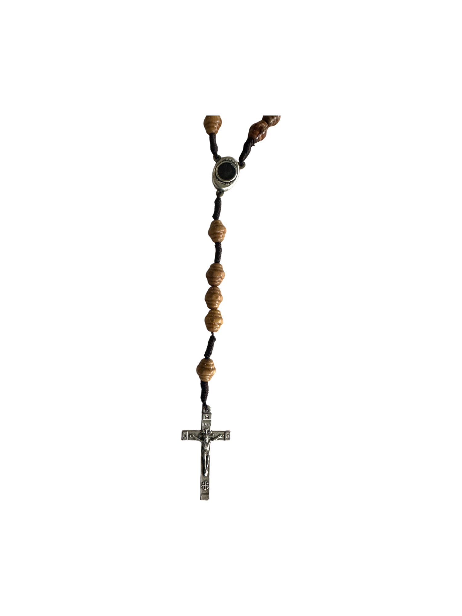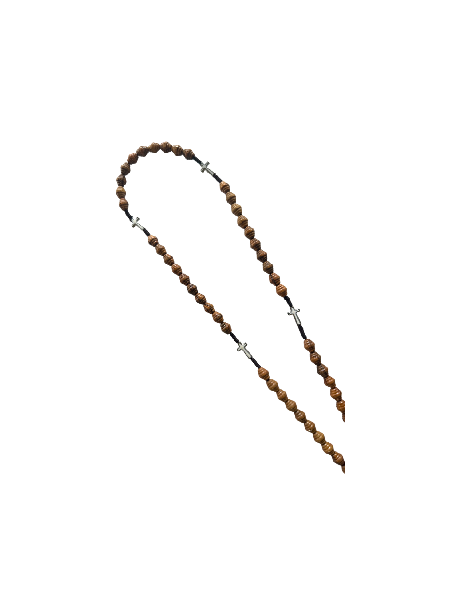 - Material: Olive wood oval beads, crucifix, metal cross, and holy sand from the Holy Land