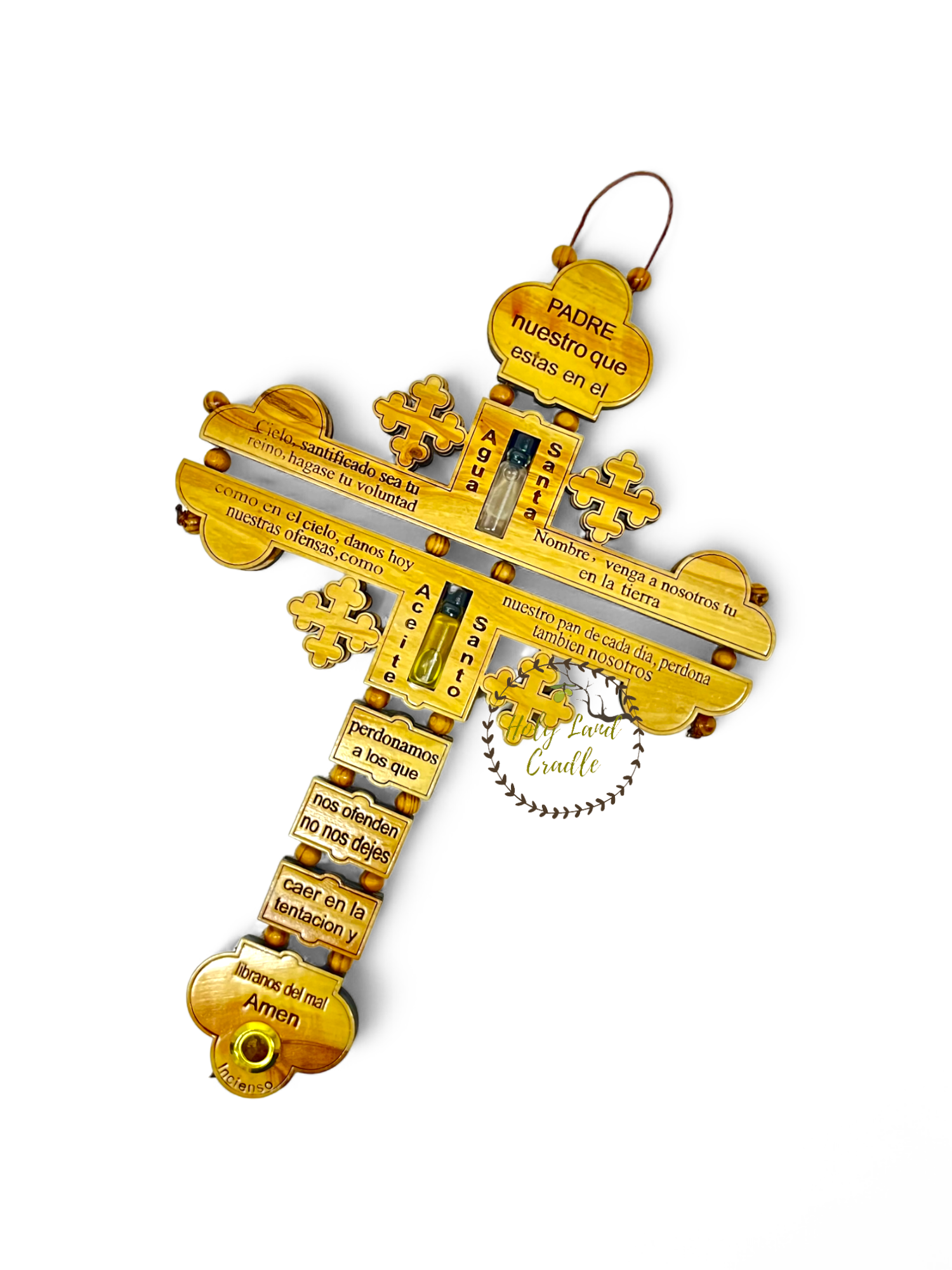 Experience the profound connection to the Holy Land with our Olive Wood The Lord's Prayer Cross. Crafted from sacred olive wood sourced from Bethlehem and Jerusalem, this cross is not only a symbol of faith but also a tangible link to the places where Jesus lived, died, and ascended to heaven.