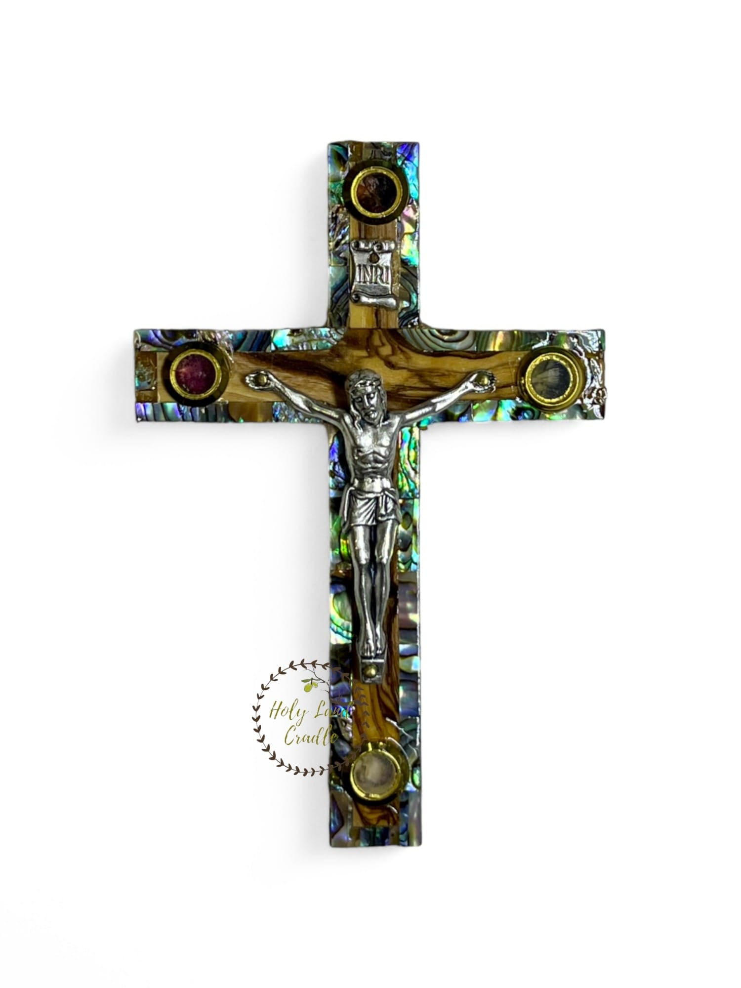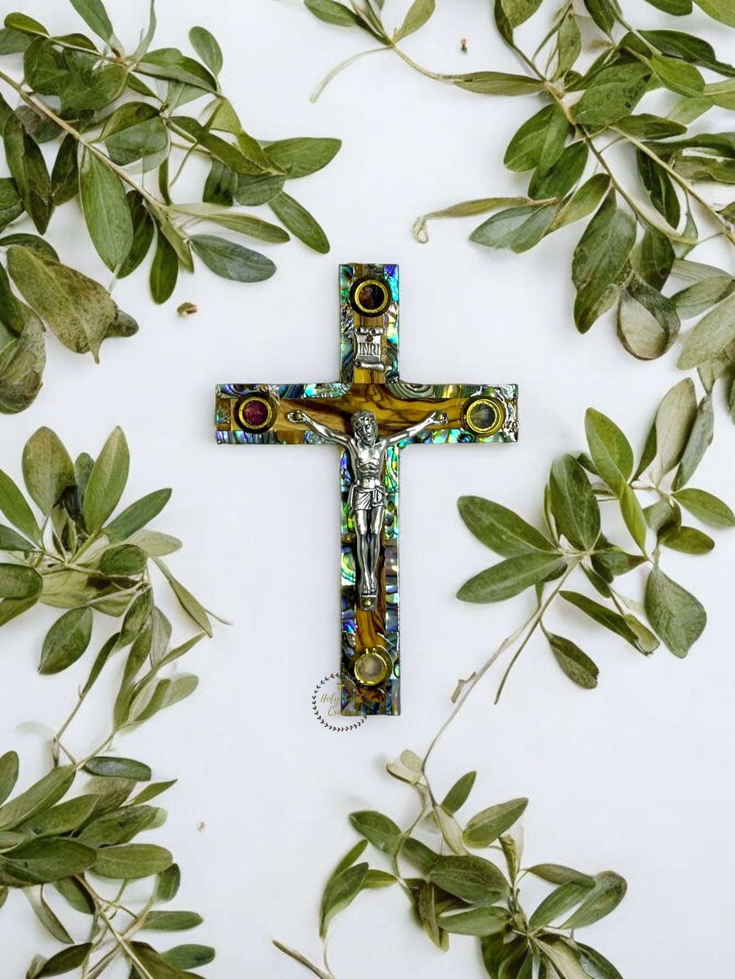 Olive wood & Mother of Pearl Cross wall hanging with Corpus, Holy Land dried Olive Leaves, Holy Earth, and Frankincense from Jerusalem. Comes with a certificate of Authenticity. Made by Christians in the Holy City where Jesus was crucified and rose on the 3rd day. Make a wonderful gift for home Blessings, Weddings, first Communion, Confirmation, Baptism, Christmas, Birthdays, Easter--or any special occasion.