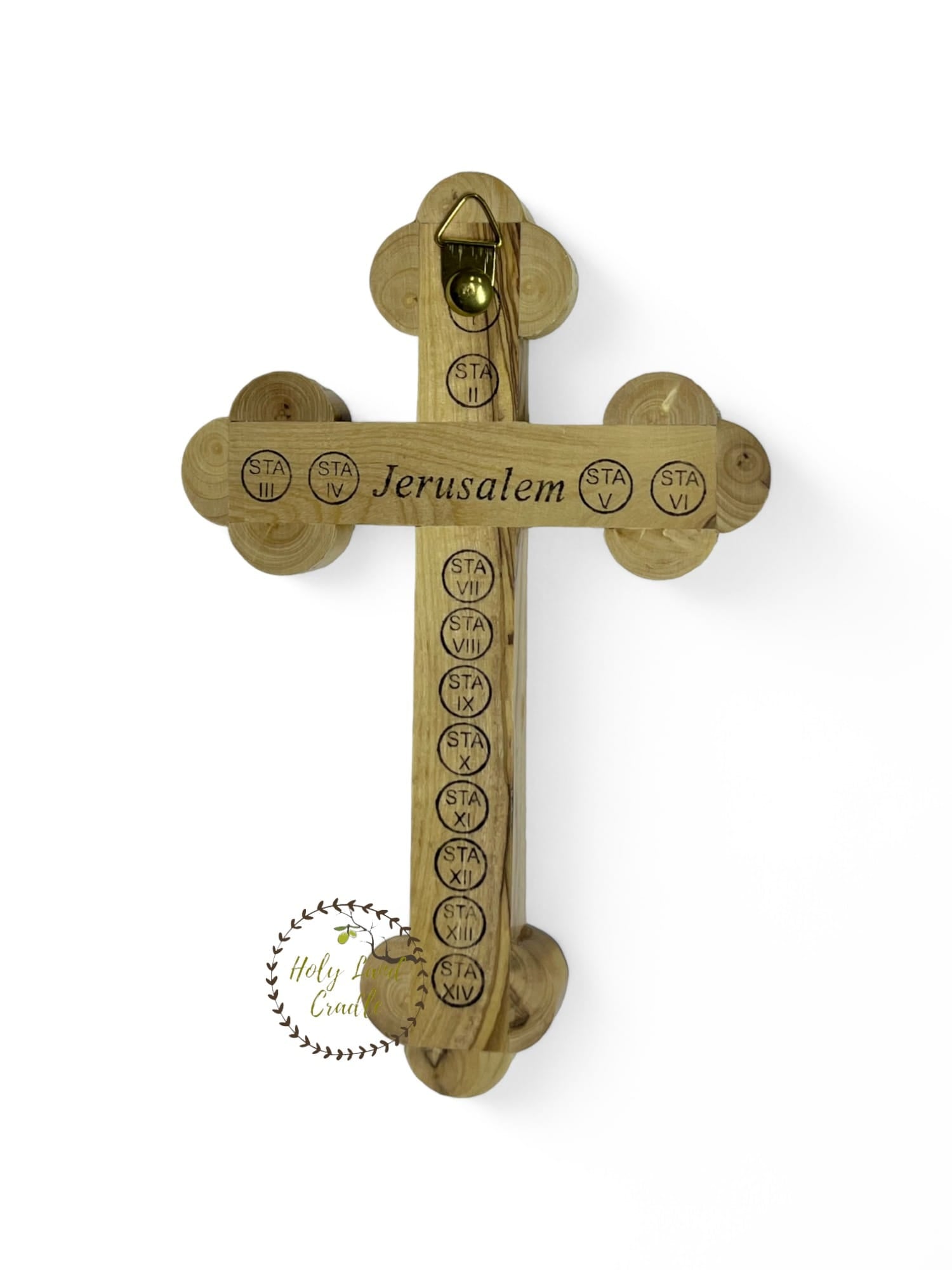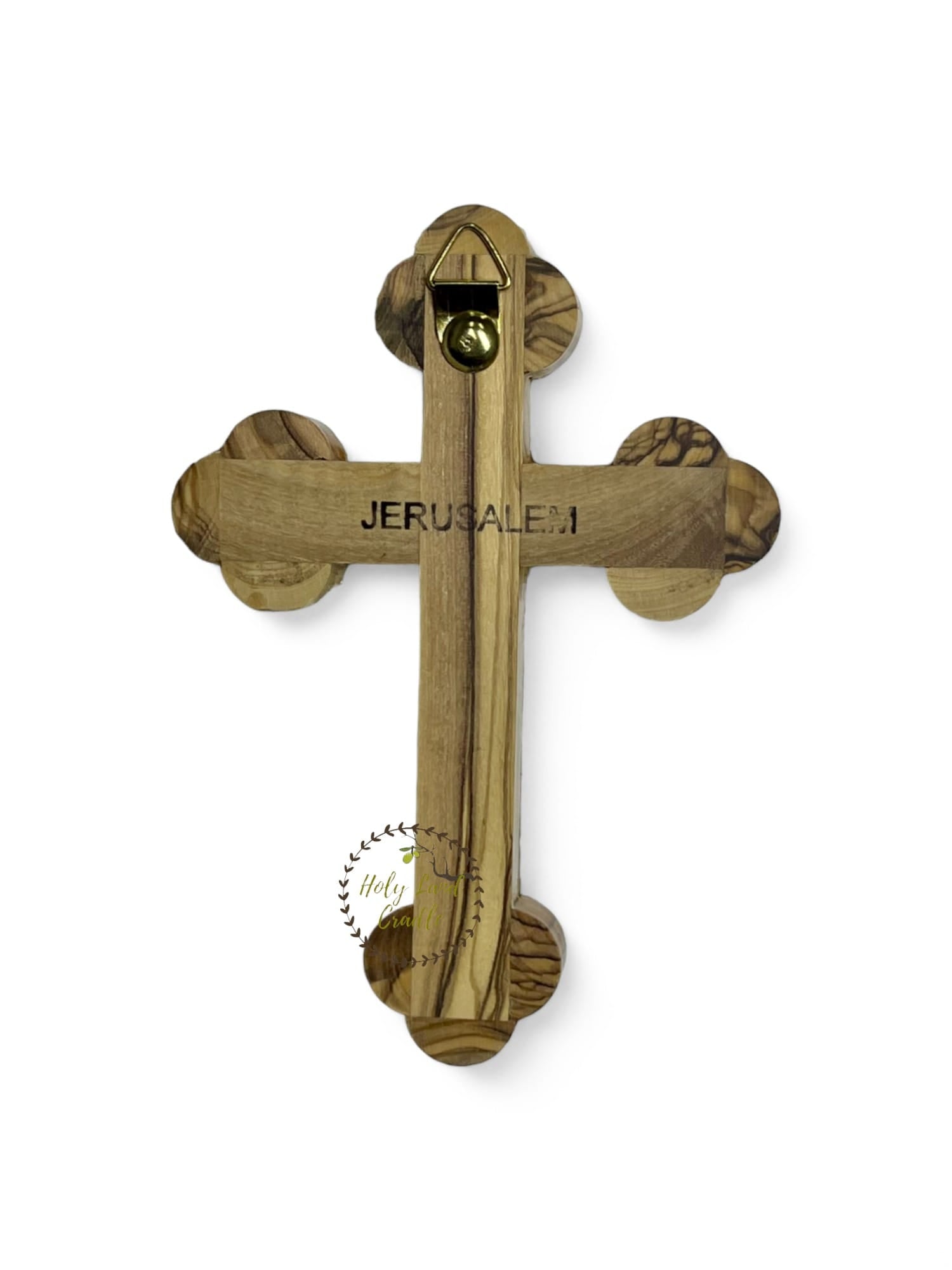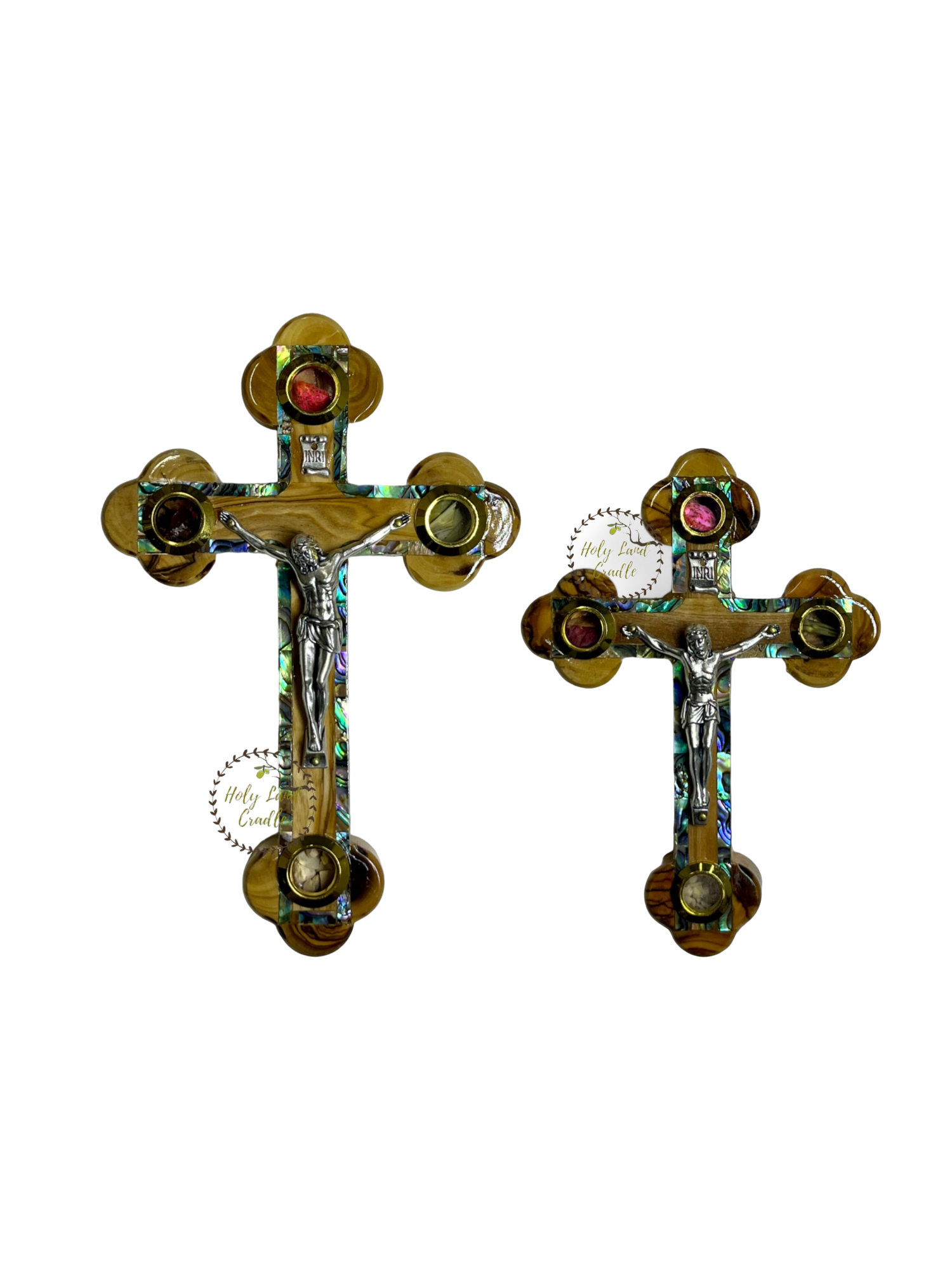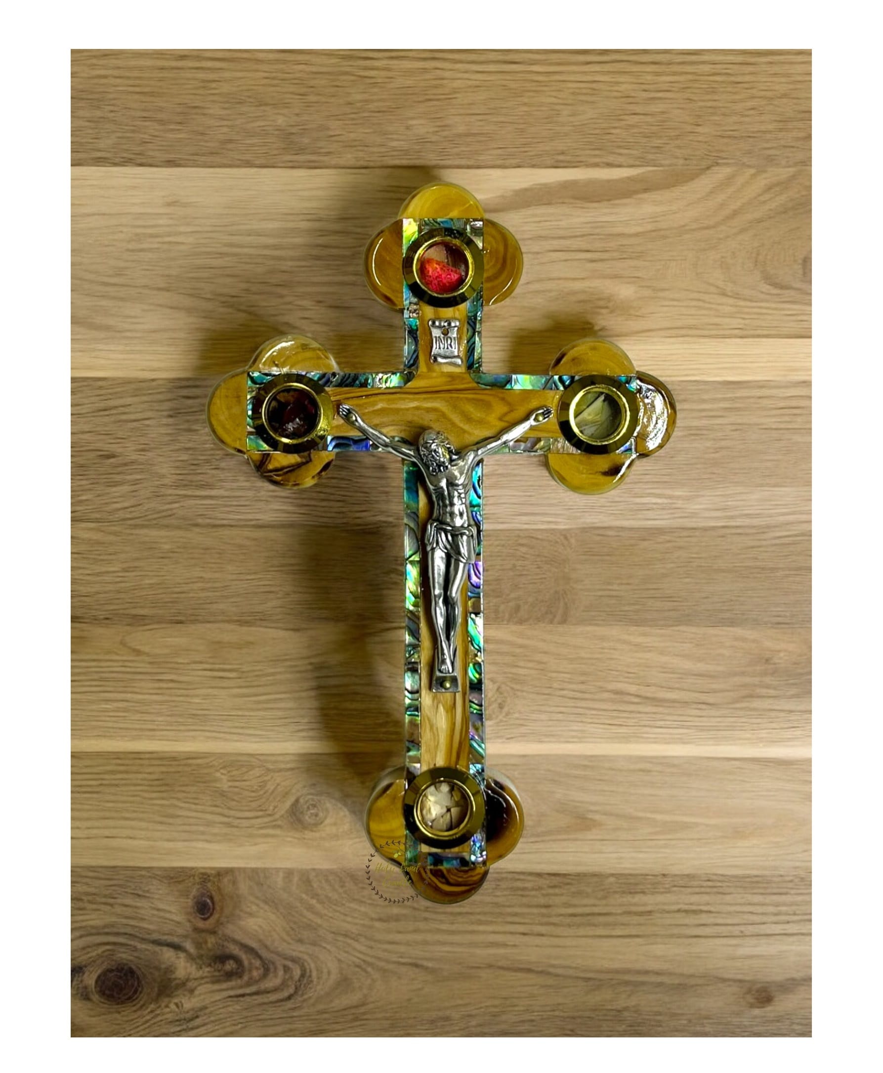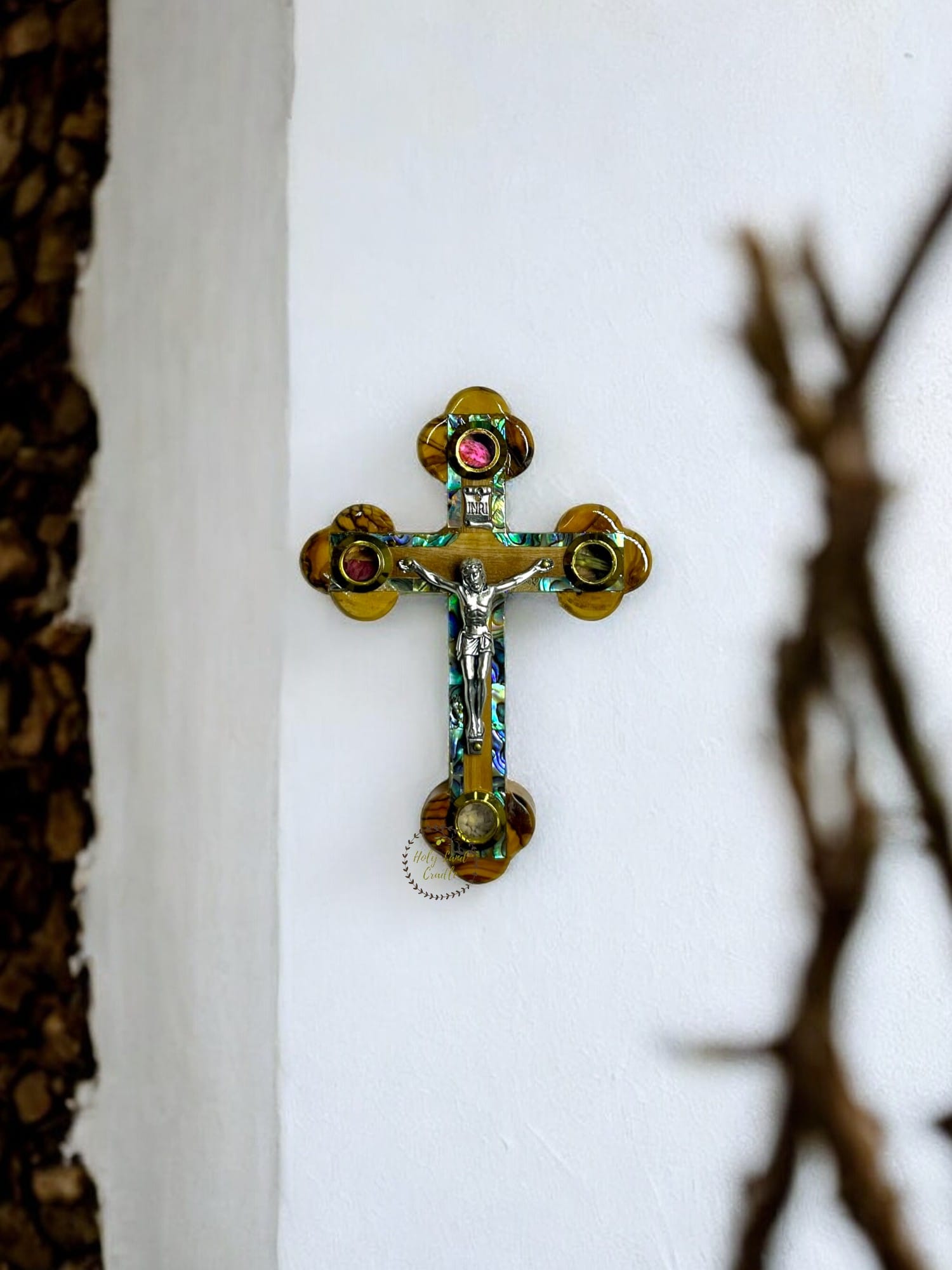 Olive wood & Mother of Pearl Cross wall hanging with Corpus, Holy Land dried Olive Leaves, Holy Earth, and Frankincense from Jerusalem. Comes with a certificate of Authenticity. Made by Christians in the Holy City where Jesus was crucified and rose on the 3rd day. Make a wonderful gift for home Blessings, Weddings, first Communion, Confirmation, Baptism, Christmas, Birthdays, Easter--or any special occasion. Please note that due to their handmade nature, crafts Colors, sizes and shapes might look slightly different from the photos on our website and social media.