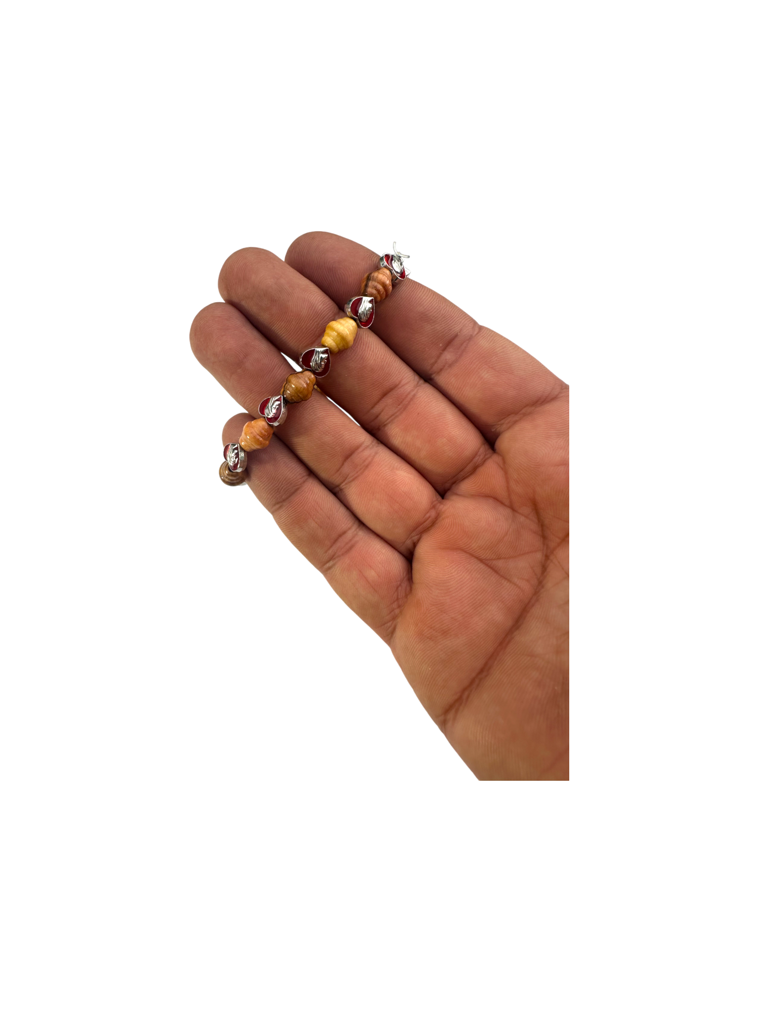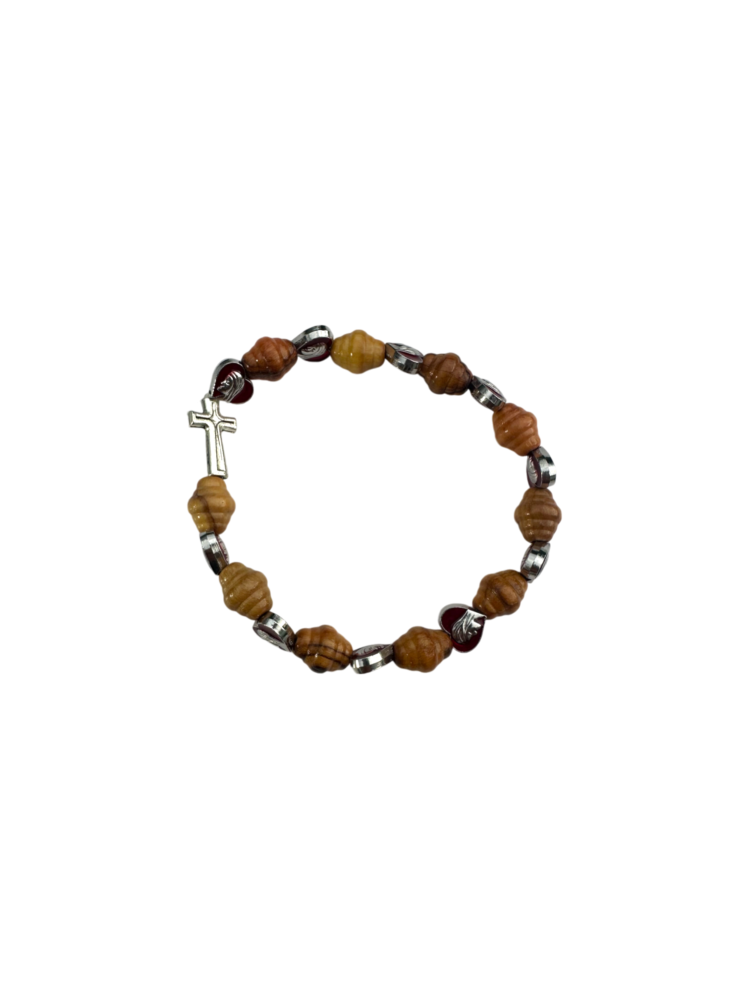 Oval Olive Wood and Red Metal Hearts with cross Bracelet, comes with a certificate of authenticity.