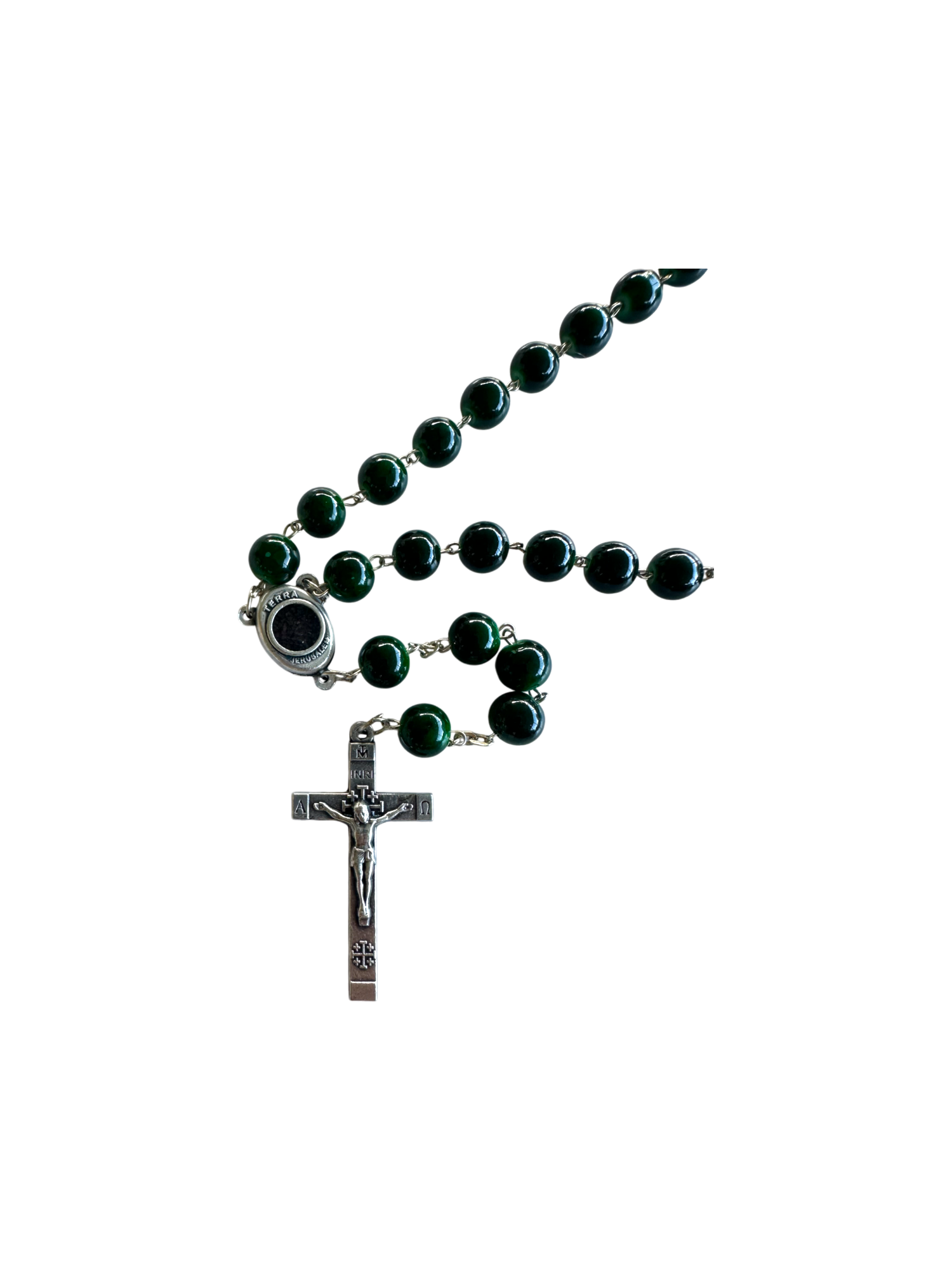This beautiful Handmade Rosary from Jerusalem is crafted with care and devotion by skilled Christian artisans in the Holy Land. Featuring vibrant green beads, a detailed crucifix, and a special inclusion of holy sand from the Holy Land, this rosary is a meaningful symbol of faith and a unique piece for prayer.