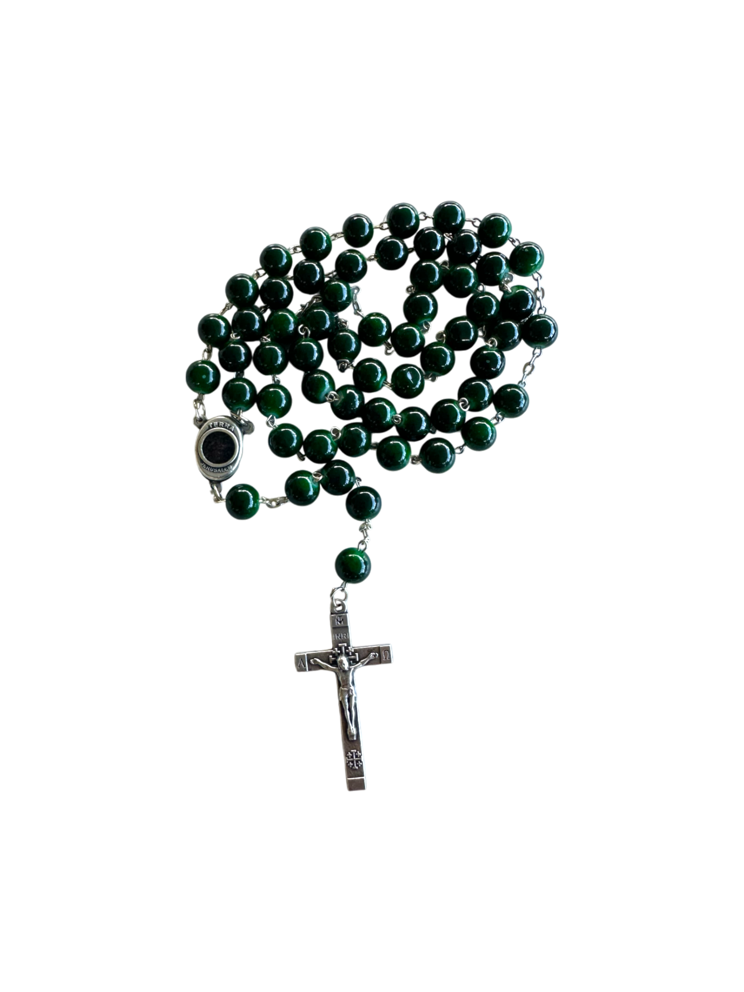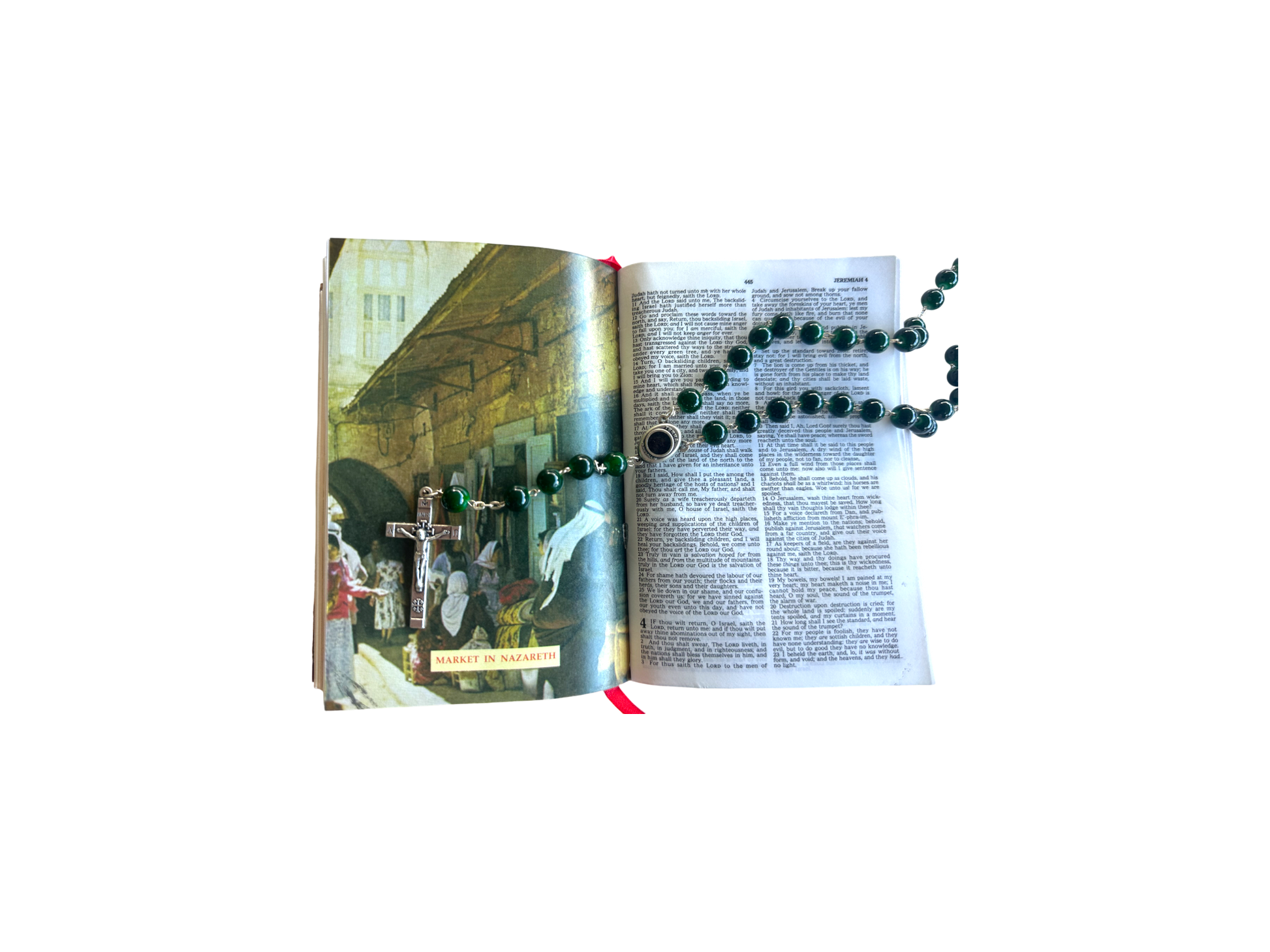 - Unique Elements: The green beads are elegantly strung to create a smooth, beautiful texture, perfect for holding and meditating upon during prayer. The rosary also includes a small compartment of holy sand from the Holy Land, adding a special spiritual connection to the place of Jesus’ birth and ministry.