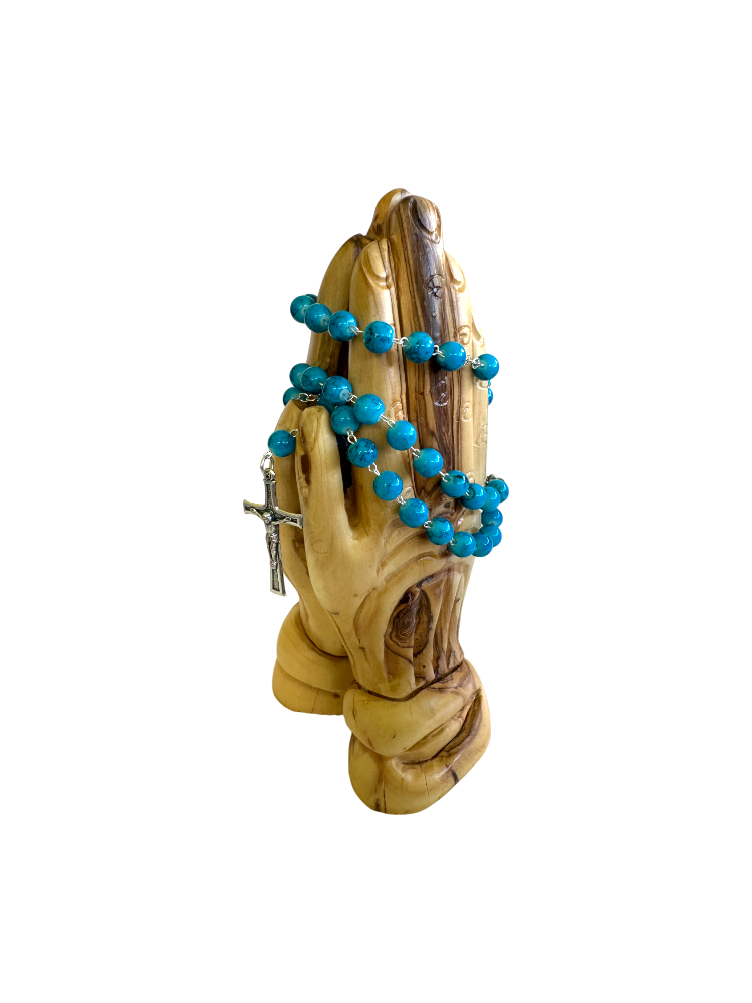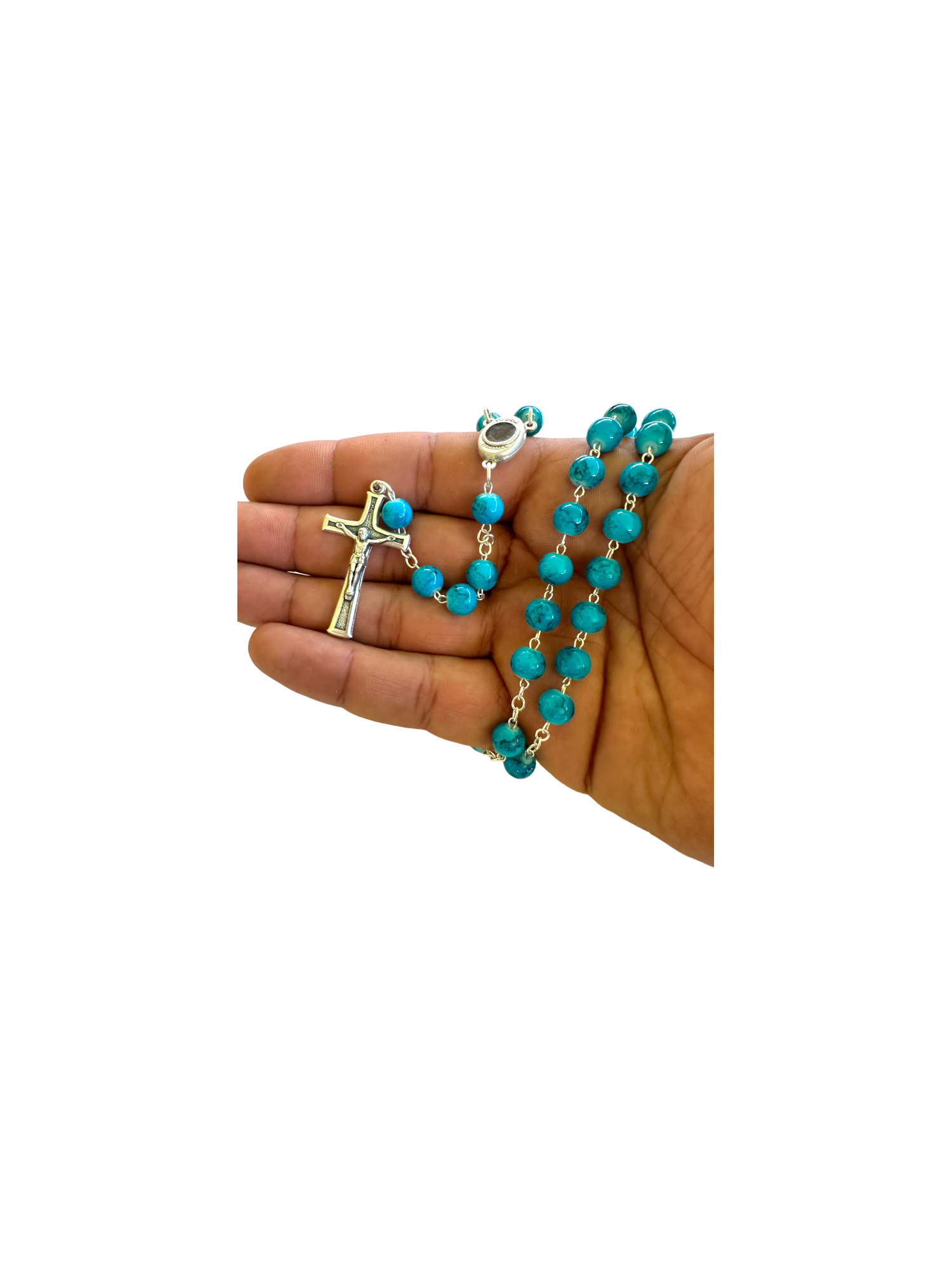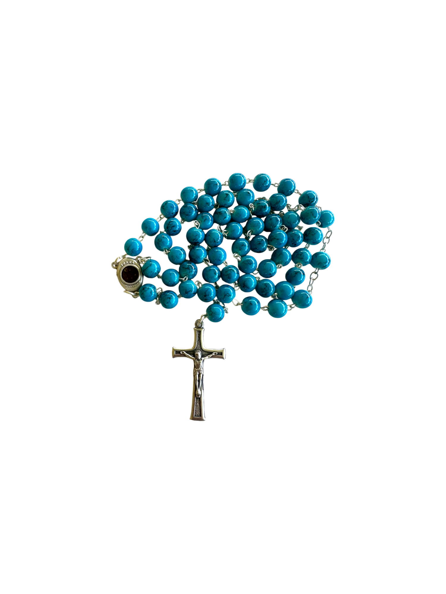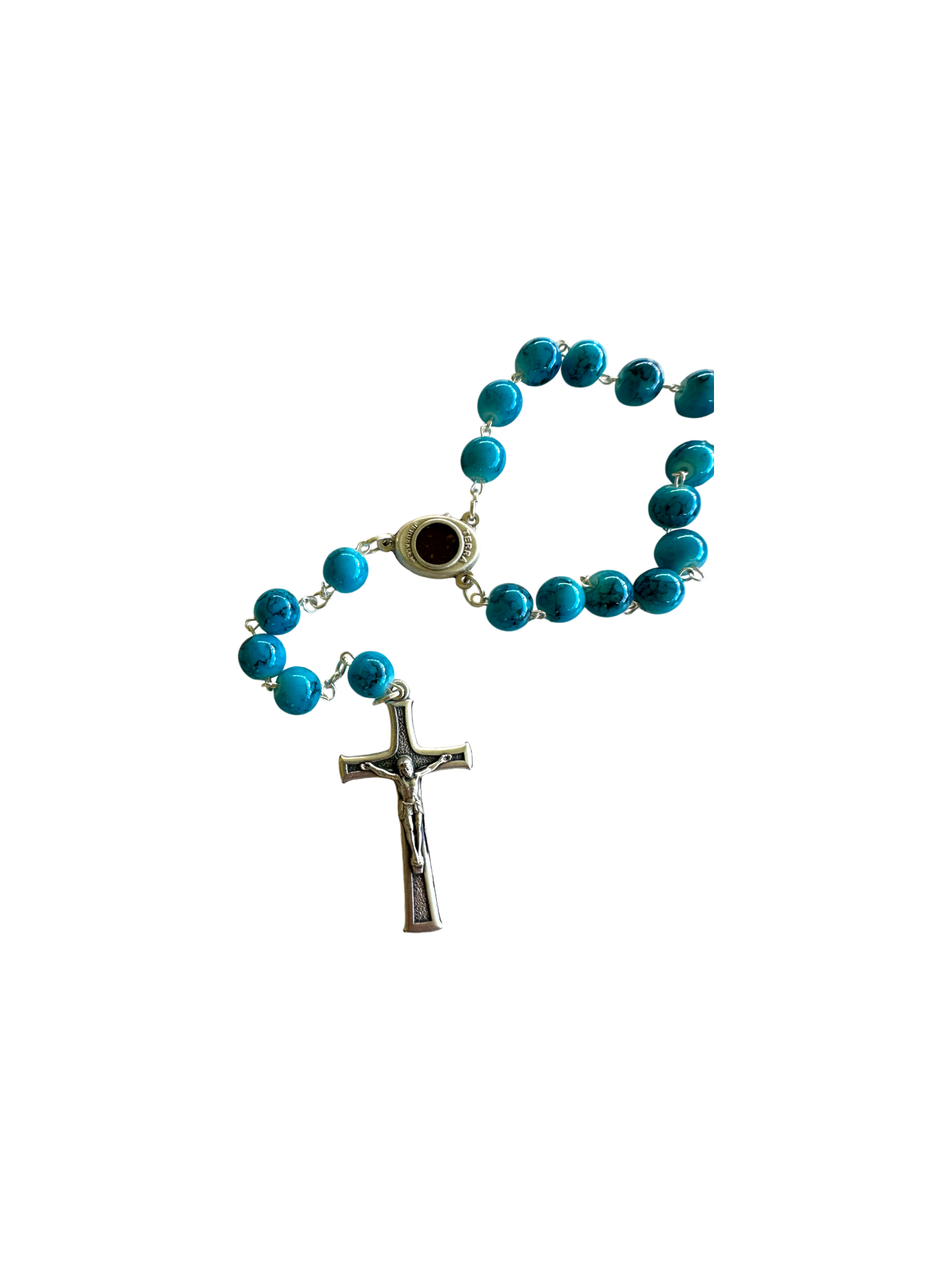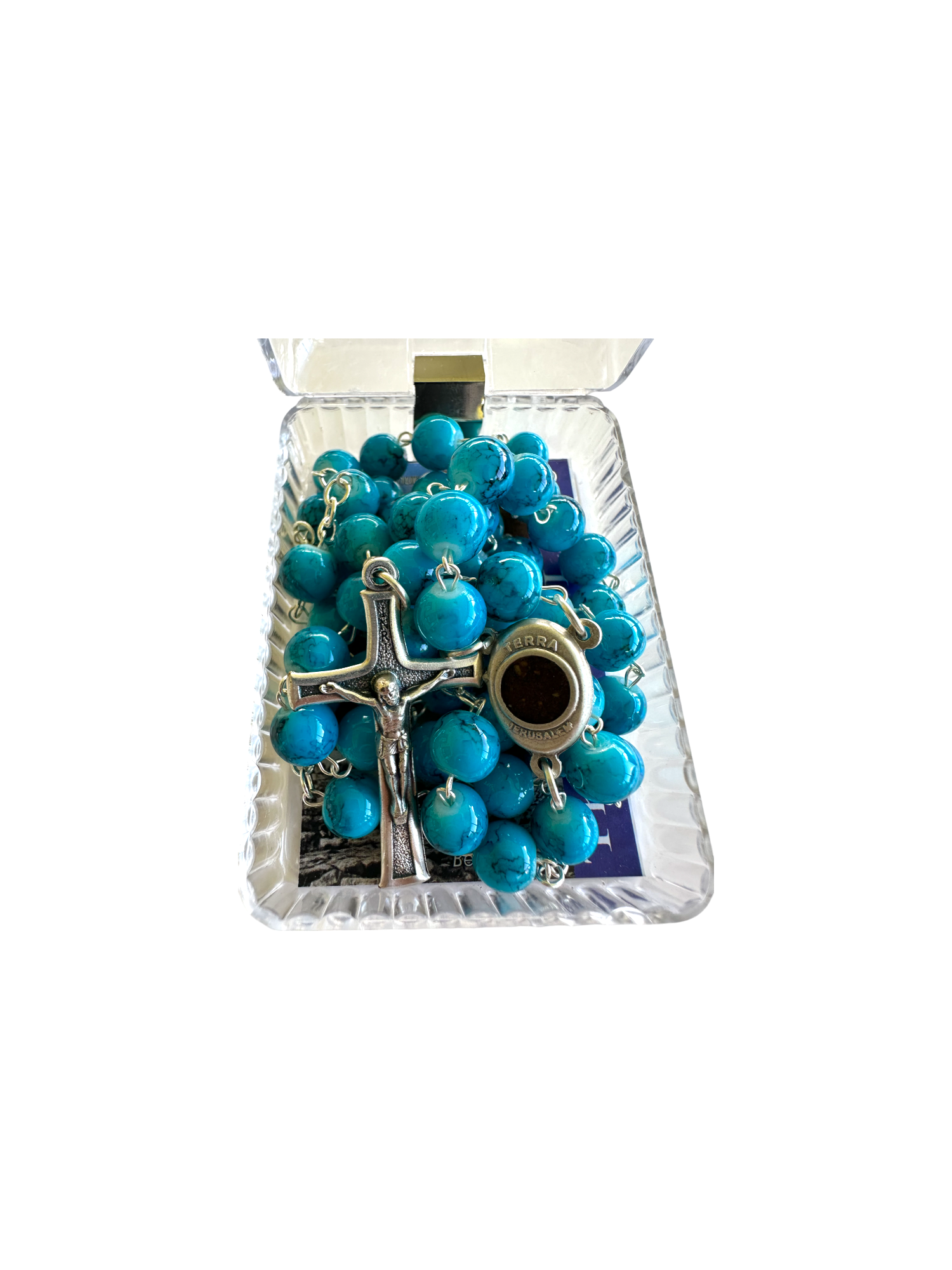 This exquisite handmade rosary, crafted in the heart of Jerusalem, the City of Our Lord, is a meaningful and cherished spiritual gift. Featuring turquoise beads, a crucifix, and holy sand from the Holy Land, it serves as a beautiful symbol of faith and devotion.