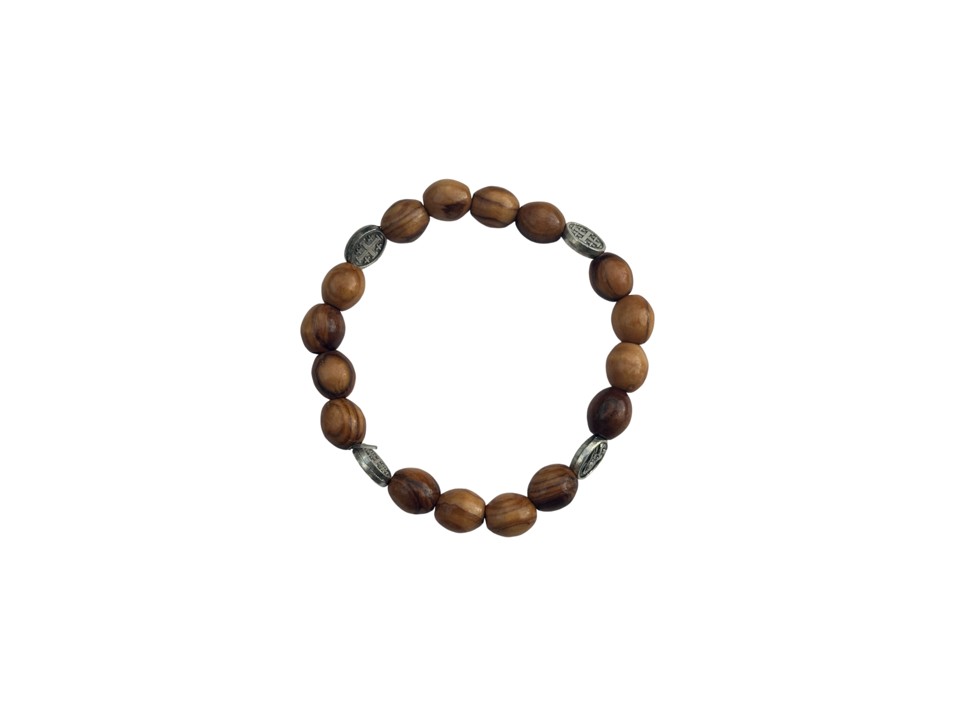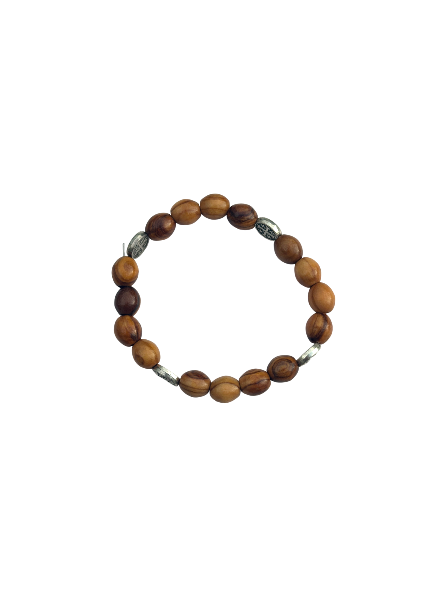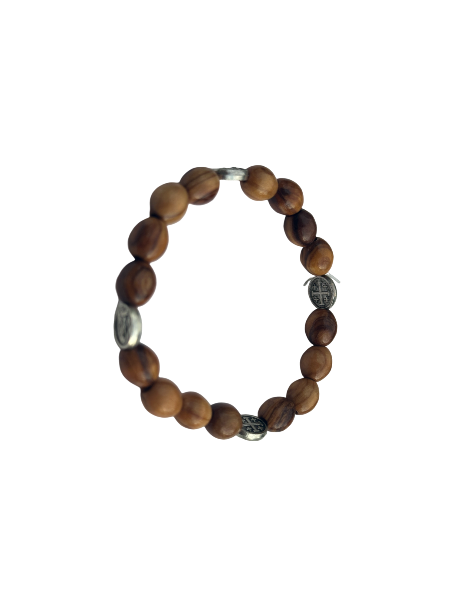 This elegant bracelet features 16 round olive wood beads, each meticulously handcrafted to showcase the natural beauty and rich texture of authentic olive wood from the Holy Land. Interspersed among the beads are 4 metal circles, each adorned with intricate designs: one side features the Jerusalem Cross, while the other side depicts the Virgin Mary.