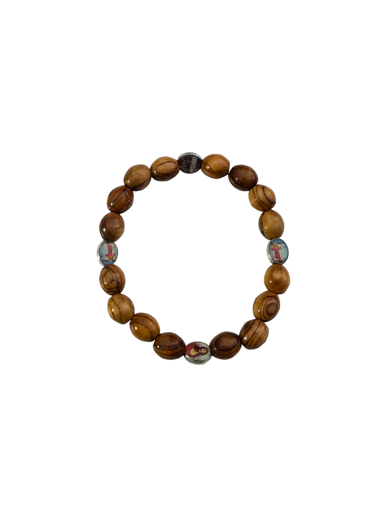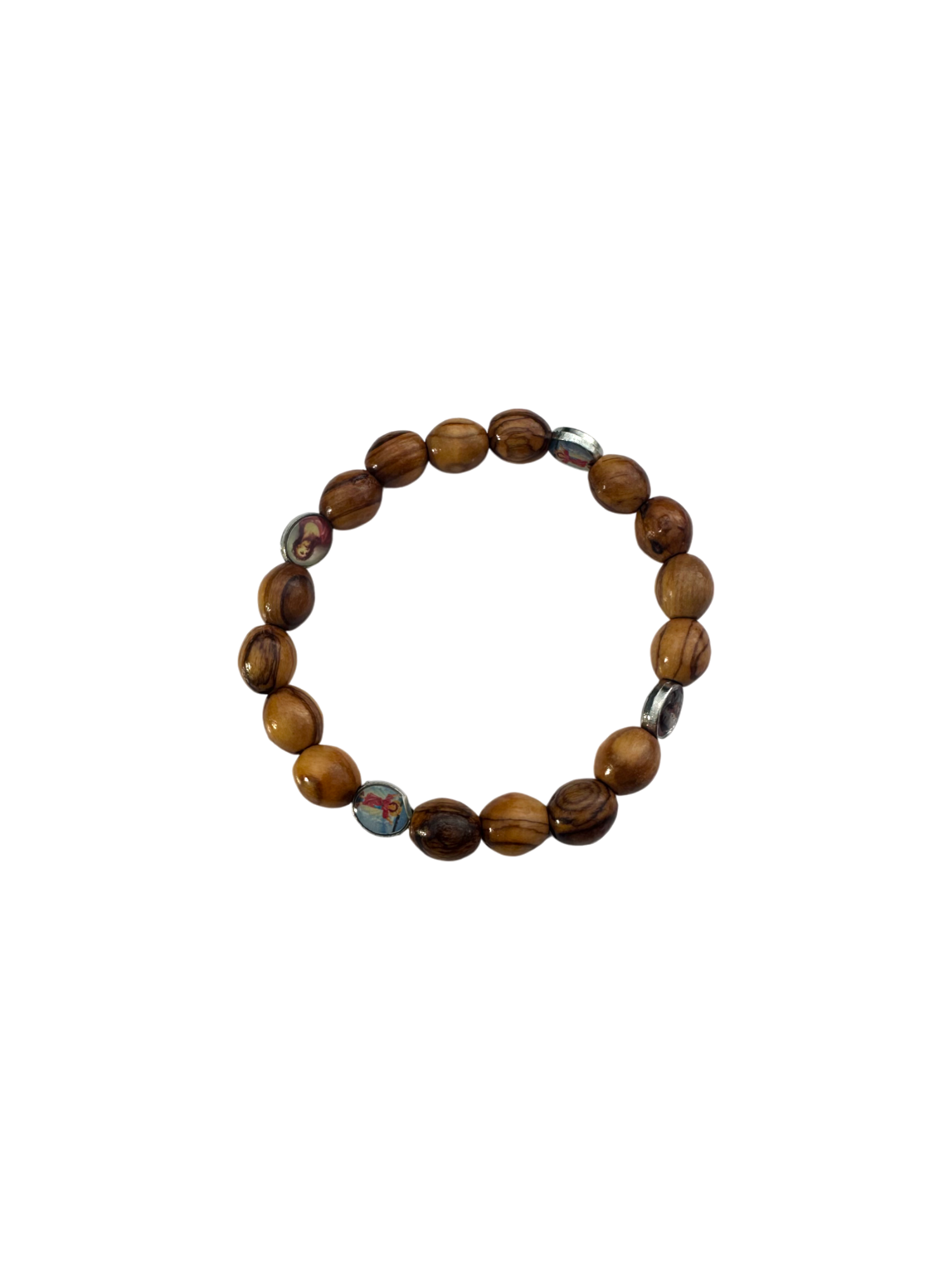 Connect with the sacred traditions of the Holy Land with this elegant bracelet, featuring 16 round olive wood beads and 4 meaningful icons. Each bead is handcrafted from genuine olive wood, known for its warm hues and unique grain patterns, making every bracelet truly one-of-a-kind. The natural beauty of the olive wood reflects the rich heritage of the Holy Land, where these beads are lovingly made by skilled artisans.